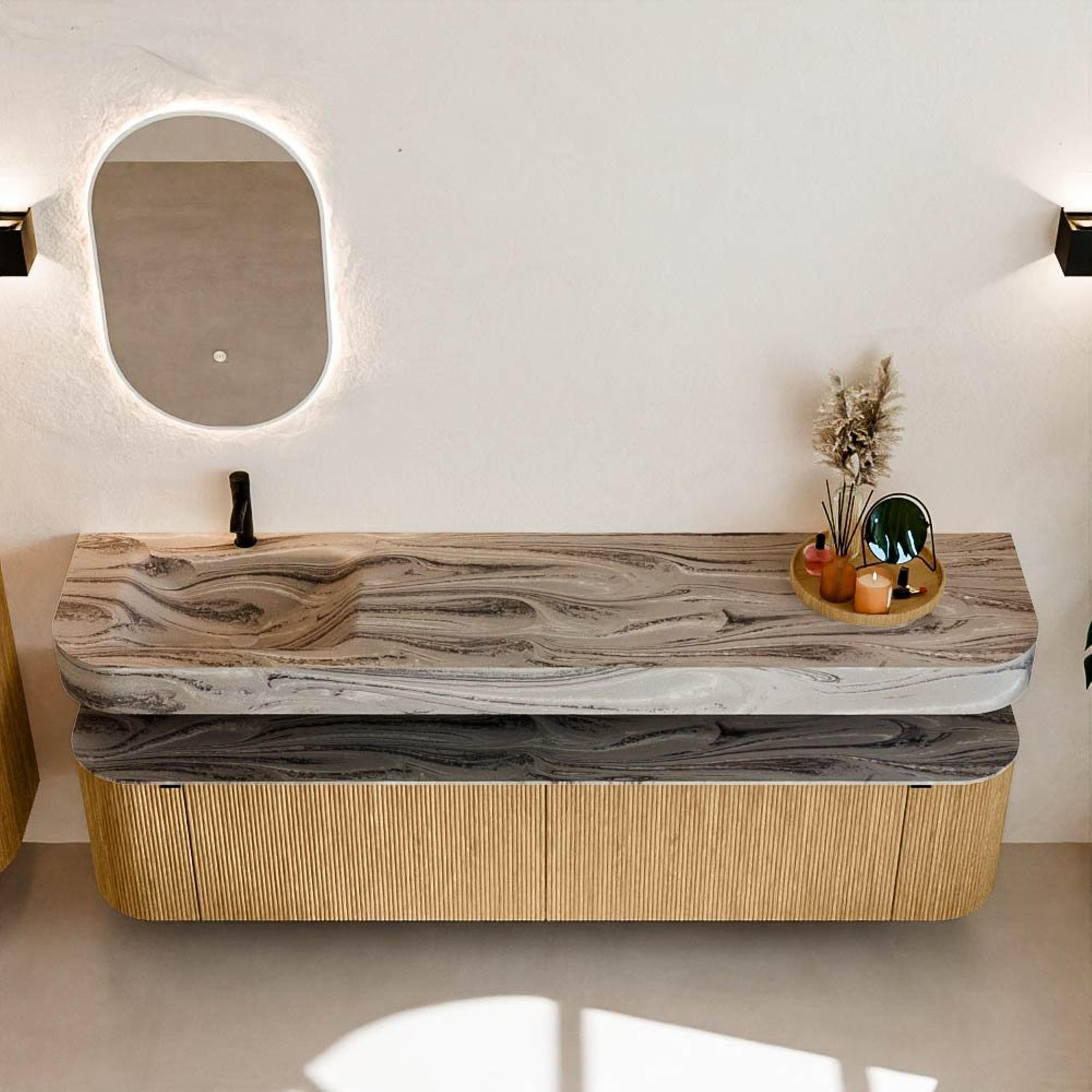 MONDIAZ THOR-DLUX 200cm badmeubel ronding links + rechts kleur Oak met 2 lades en 2 deuren. Vrijhangende wastafel CLOUD Links 1 kraangat kleur Sombra.