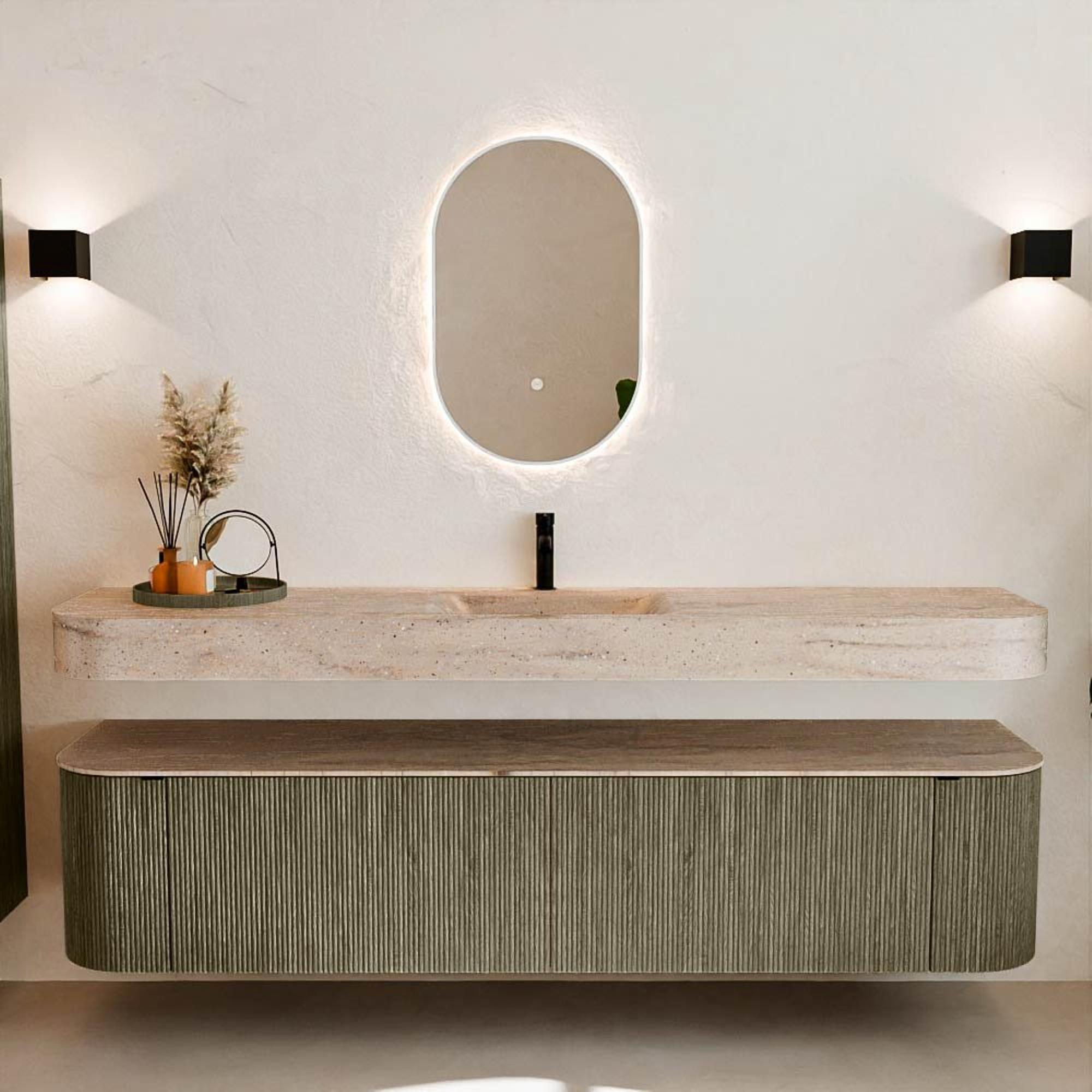 Natuurlijke materialen in warme tinten. De verticale ribbels brengen ritme en textuur in het ontwerp, terwijl het eikenhout zorgt voor een warme, ambachtelijke uitstraling. Kies uit 5 houttinten OAK, WALNUT, DUSK, SHADOW en RUBY zorgvuldig geselecteerde houtkleuren om zowel moderne als klassieke badkamers te verrijken.