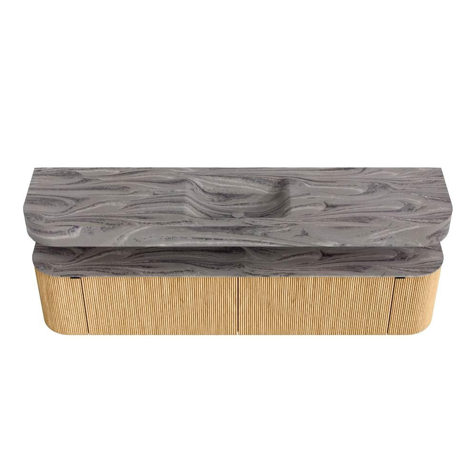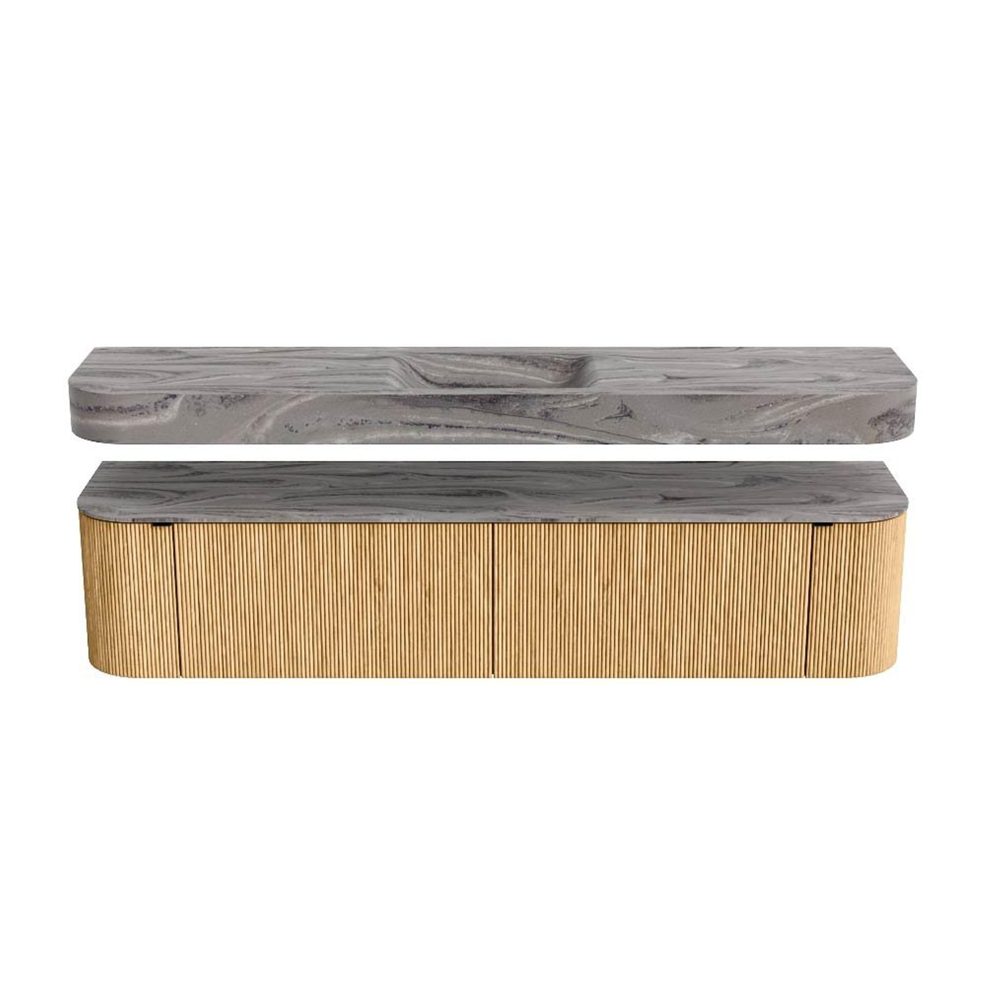 MONDIAZ THOR-DLUX 200cm badmeubel ronding links + rechts kleur Oak met 2 lades en 2 deuren. Vrijhangende wastafel CLOUD Midden 1 kraangat kleur Sombra.