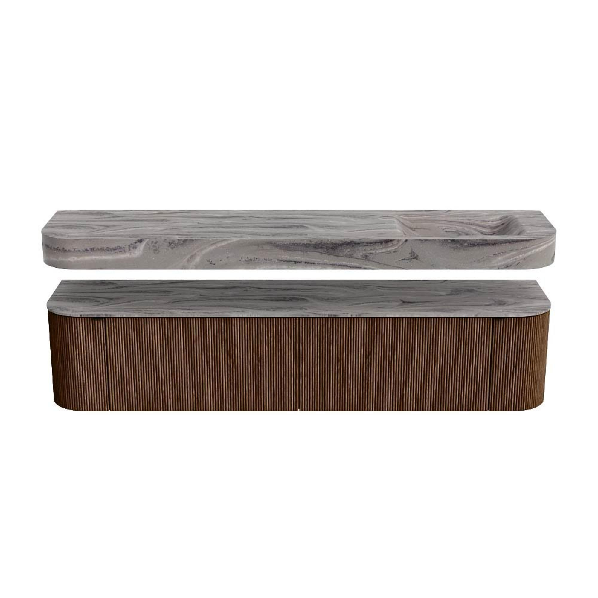 Boven het meubel zweeft een bijpassende, vrij hangende wastafel met afgeronde hoeken – perfect afgestemd op de vorm van de kast. De wastafel is uitgevoerd in Solid Surface en volgt subtiel de lijnen van het onderliggende meubel, waardoor een harmonieus geheel ontstaat. Het Solid Surface topblad vormt een sterke, onderhoudsvriendelijke basis en maakt de combinatie compleet.