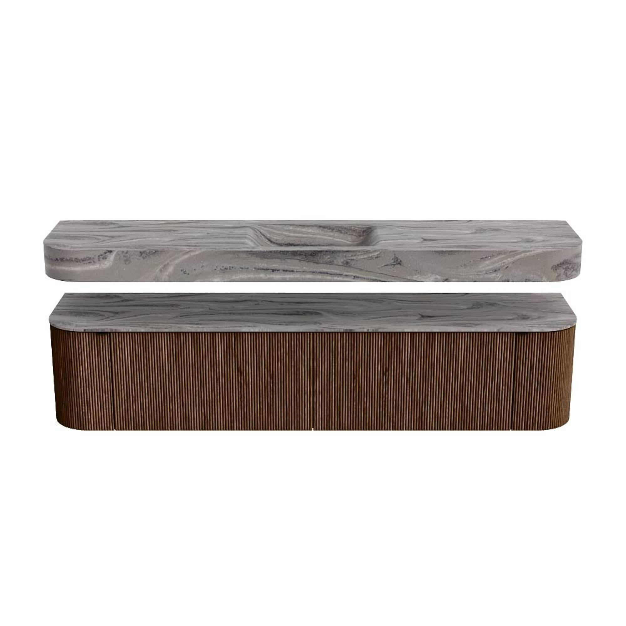Boven het meubel zweeft een bijpassende, vrij hangende wastafel met afgeronde hoeken – perfect afgestemd op de vorm van de kast. De wastafel is uitgevoerd in Solid Surface en volgt subtiel de lijnen van het onderliggende meubel, waardoor een harmonieus geheel ontstaat. Het Solid Surface topblad vormt een sterke, onderhoudsvriendelijke basis en maakt de combinatie compleet.