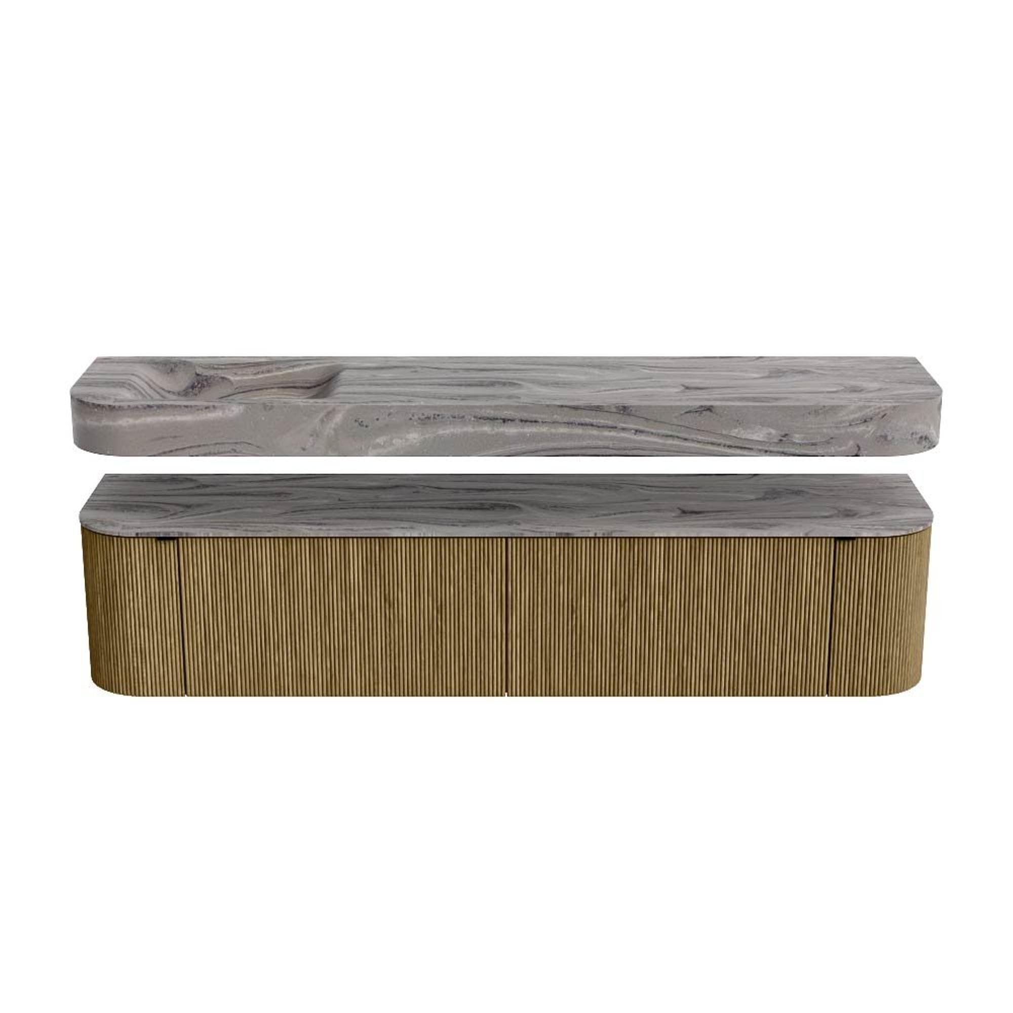 Boven het meubel zweeft een bijpassende, vrij hangende wastafel met afgeronde hoeken – perfect afgestemd op de vorm van de kast. De wastafel is uitgevoerd in Solid Surface en volgt subtiel de lijnen van het onderliggende meubel, waardoor een harmonieus geheel ontstaat. Het Solid Surface topblad vormt een sterke, onderhoudsvriendelijke basis en maakt de combinatie compleet.