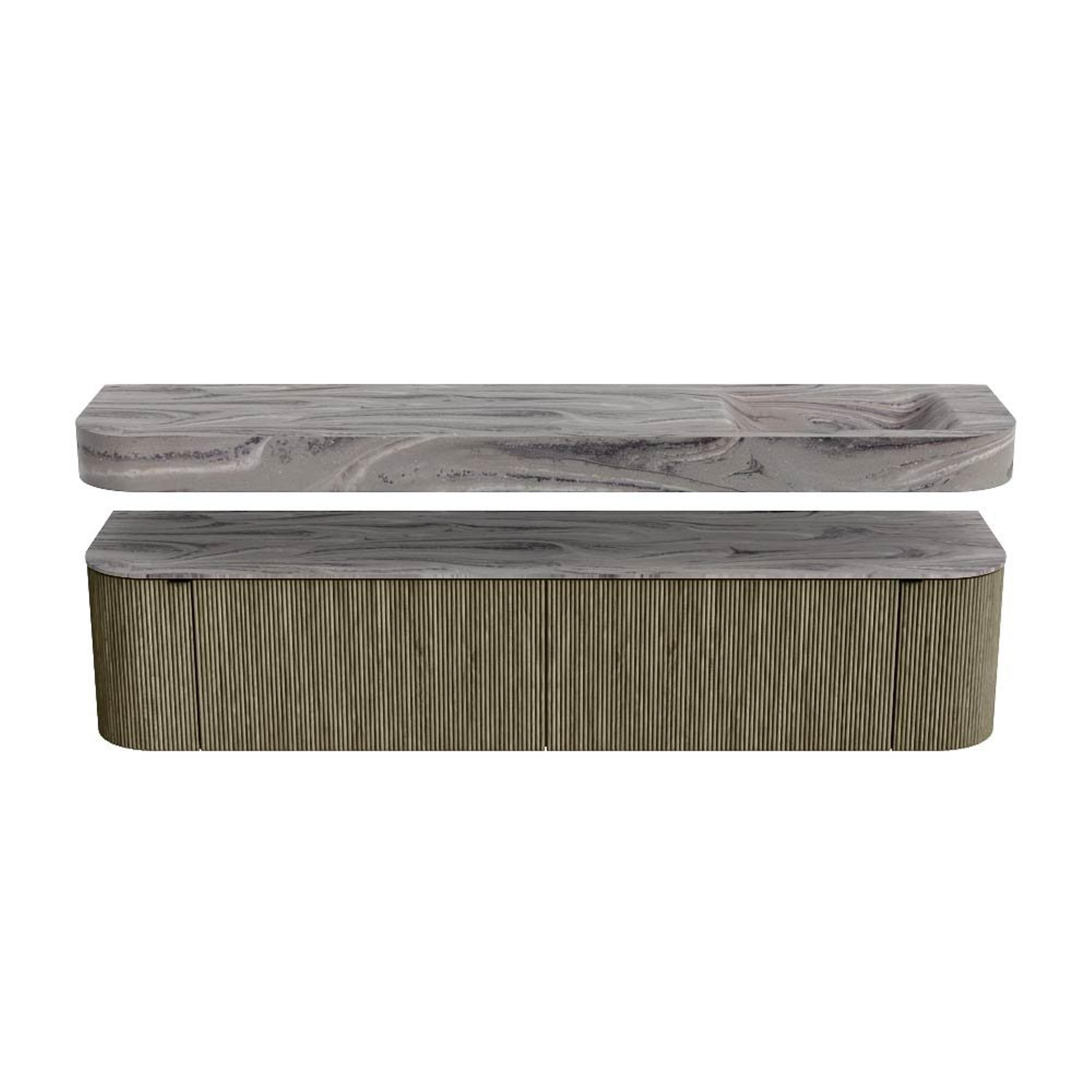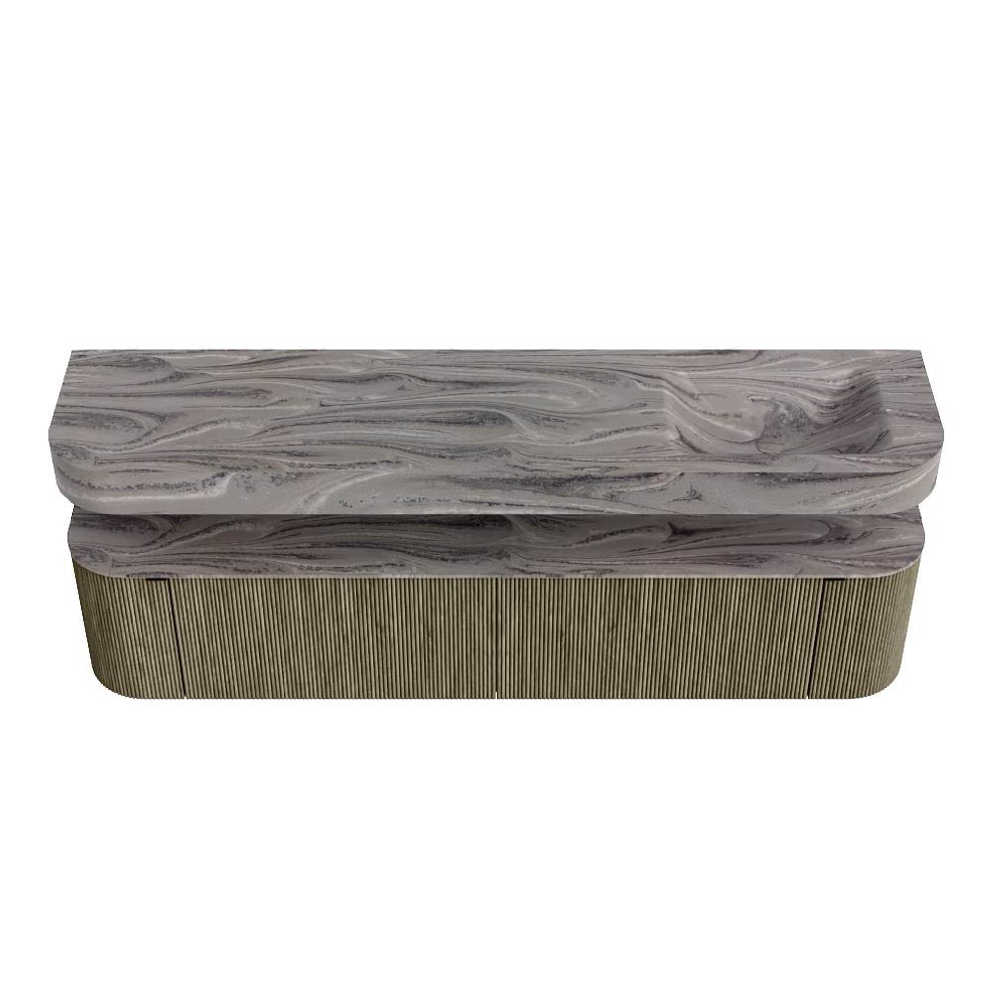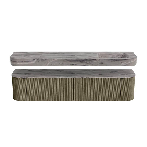 Boven het meubel zweeft een bijpassende, vrij hangende wastafel met afgeronde hoeken – perfect afgestemd op de vorm van de kast. De wastafel is uitgevoerd in Solid Surface en volgt subtiel de lijnen van het onderliggende meubel, waardoor een harmonieus geheel ontstaat. Het Solid Surface topblad vormt een sterke, onderhoudsvriendelijke basis en maakt de combinatie compleet.