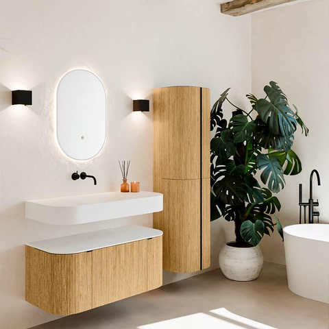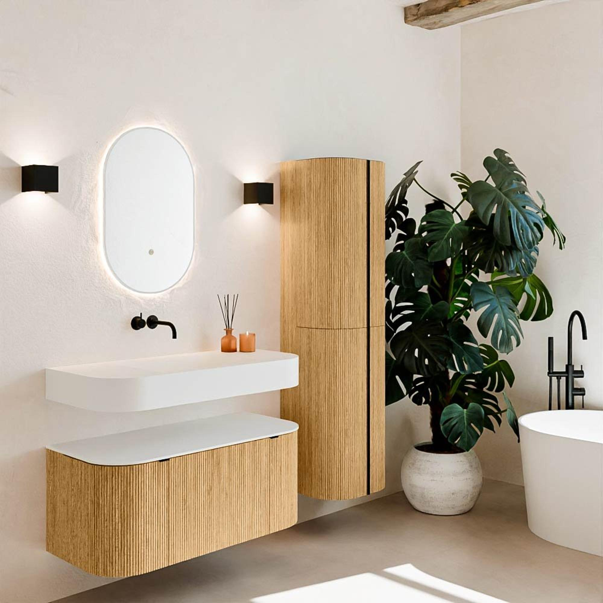 Natuurlijke materialen in warme tinten. De verticale ribbels brengen ritme en textuur in het ontwerp, terwijl het eikenhout zorgt voor een warme, ambachtelijke uitstraling. Kies uit 5 houttinten OAK, WALNUT, DUSK, SHADOW en RUBY zorgvuldig geselecteerde houtkleuren om zowel moderne als klassieke badkamers te verrijken.