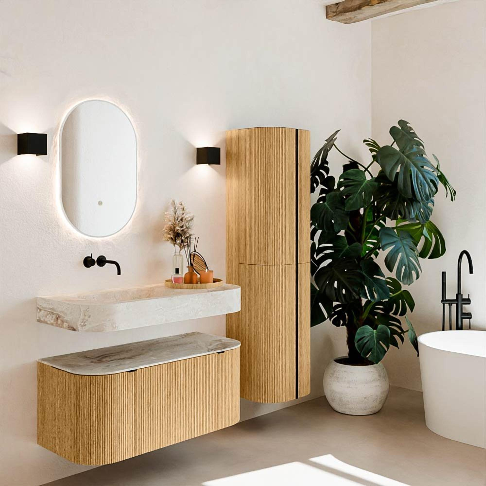 Natuurlijke materialen in warme tinten. De verticale ribbels brengen ritme en textuur in het ontwerp, terwijl het eikenhout zorgt voor een warme, ambachtelijke uitstraling. Kies uit 5 houttinten OAK, WALNUT, DUSK, SHADOW en RUBY zorgvuldig geselecteerde houtkleuren om zowel moderne als klassieke badkamers te verrijken.