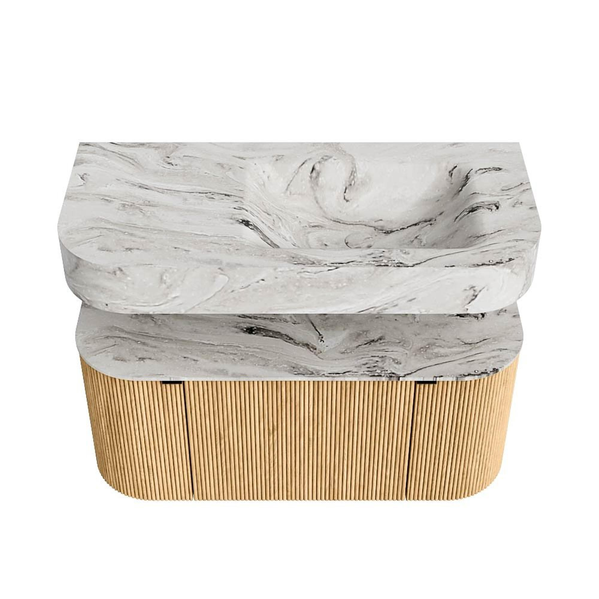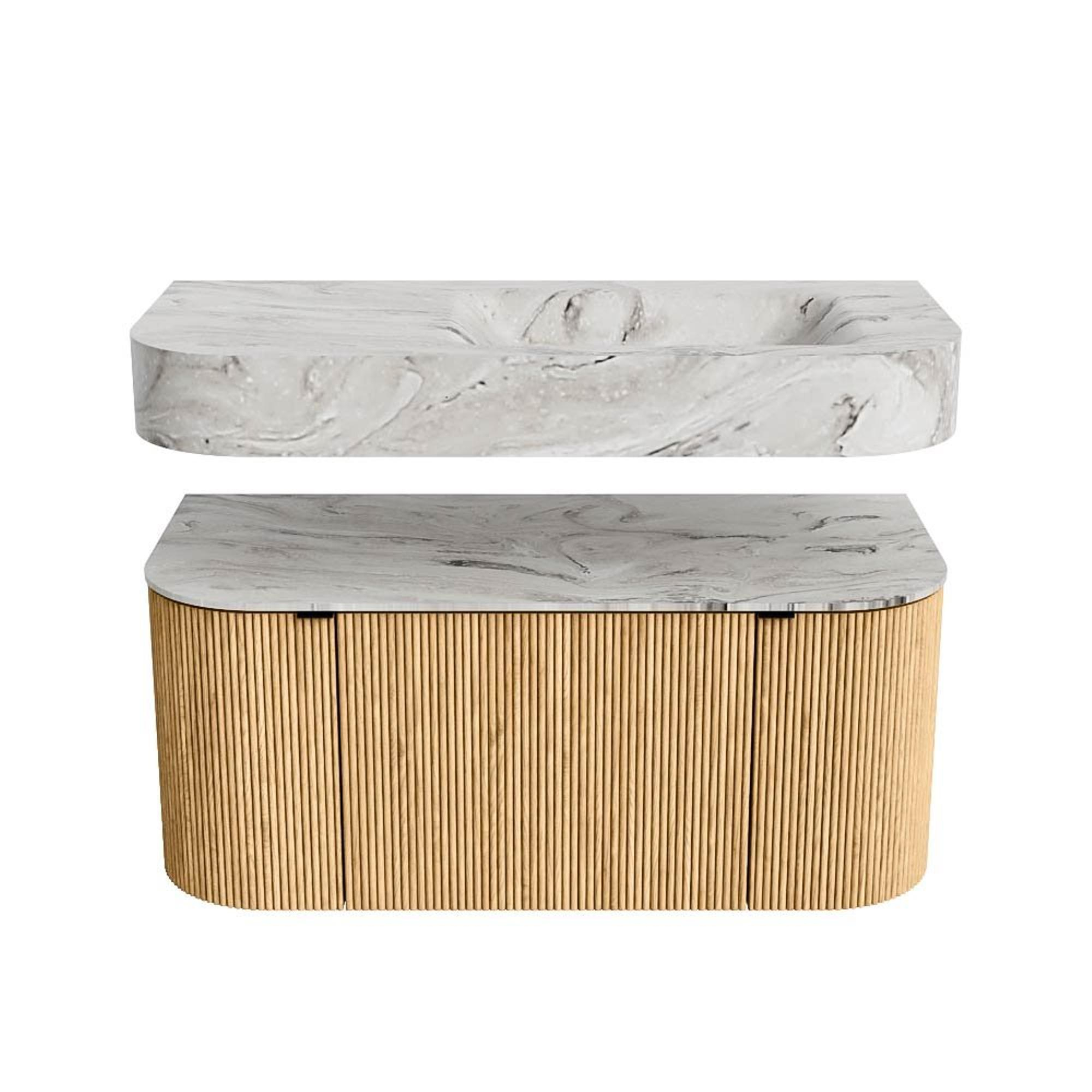 MONDIAZ THOR-DLUX 100cm badmeubel ronding links + rechts kleur Oak met 1 lade en 2 deuren. Vrijhangende wastafel CLOUD Rechts zonder kraangat kleur Glace.