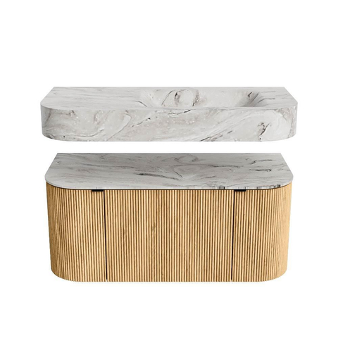 Boven het meubel zweeft een bijpassende, vrij hangende wastafel met afgeronde hoeken – perfect afgestemd op de vorm van de kast. De wastafel is uitgevoerd in Solid Surface en volgt subtiel de lijnen van het onderliggende meubel, waardoor een harmonieus geheel ontstaat. Het Solid Surface topblad vormt een sterke, onderhoudsvriendelijke basis en maakt de combinatie compleet.