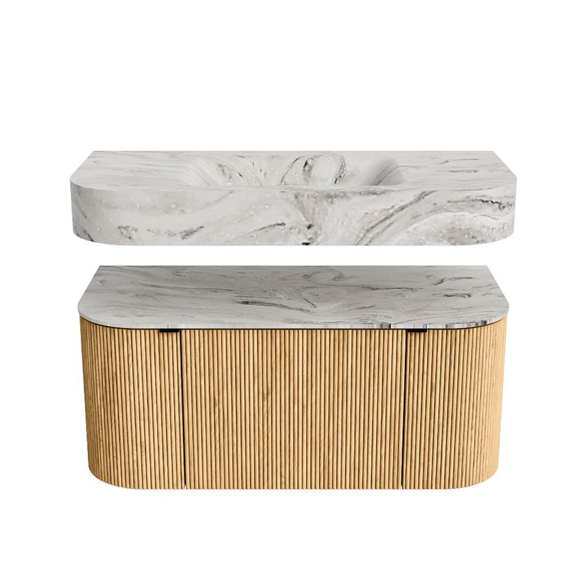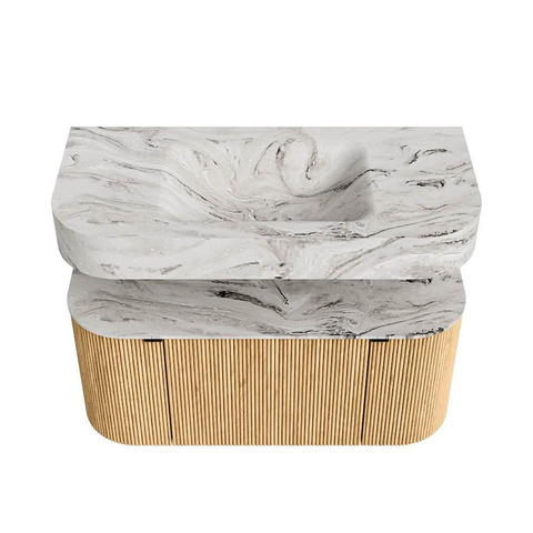 MONDIAZ THOR-DLUX 100cm badmeubel ronding links + rechts kleur Oak met 1 lade en 2 deuren. Vrijhangende wastafel CLOUD Midden zonder kraangat kleur Glace.