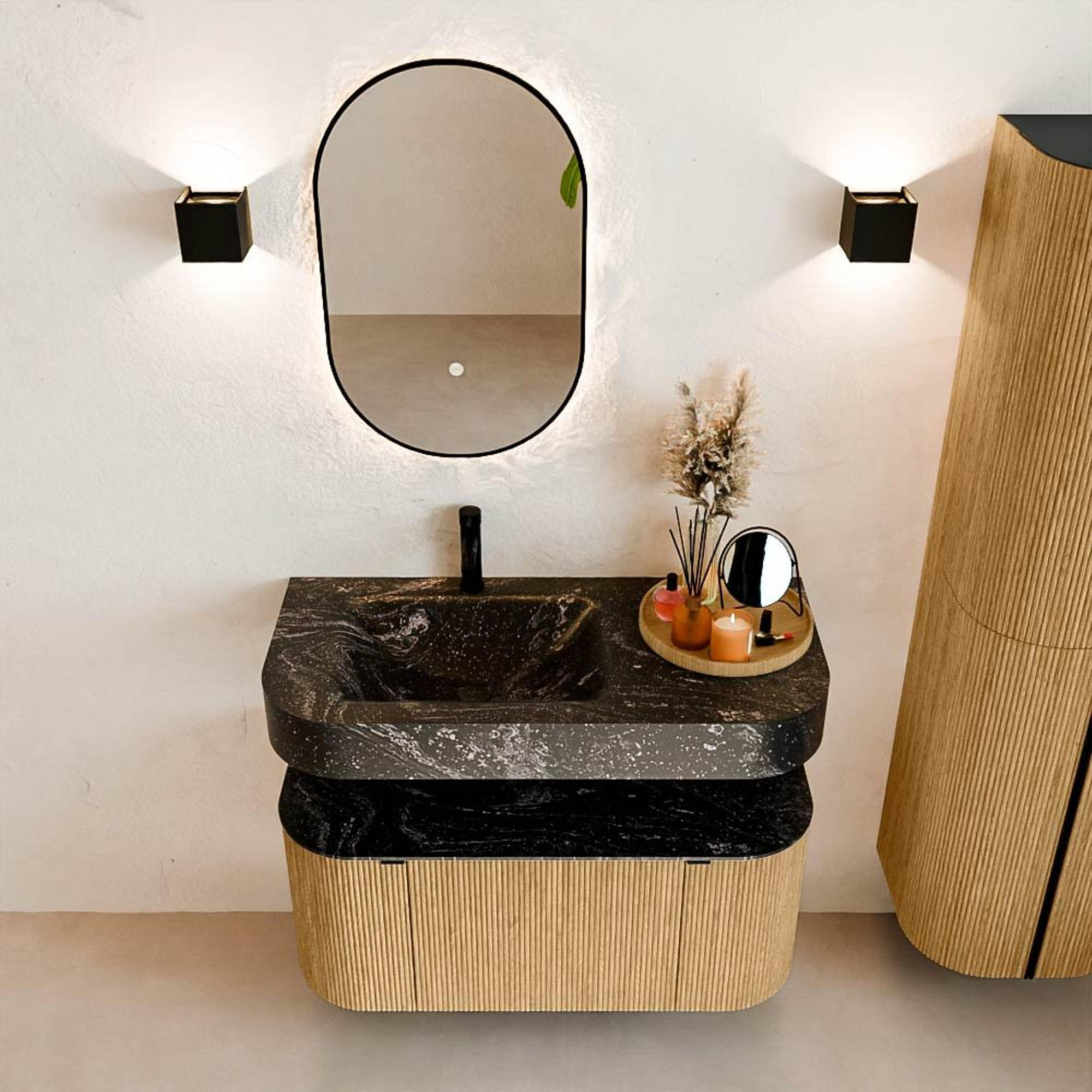 MONDIAZ THOR-DLUX 100cm badmeubel ronding links + rechts kleur Oak met 1 lade en 2 deuren. Vrijhangende wastafel CLOUD Links 1 kraangat kleur Lava.