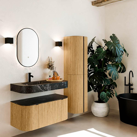 Natuurlijke materialen in warme tinten. De verticale ribbels brengen ritme en textuur in het ontwerp, terwijl het eikenhout zorgt voor een warme, ambachtelijke uitstraling. Kies uit 5 houttinten OAK, WALNUT, DUSK, SHADOW en RUBY zorgvuldig geselecteerde houtkleuren om zowel moderne als klassieke badkamers te verrijken.