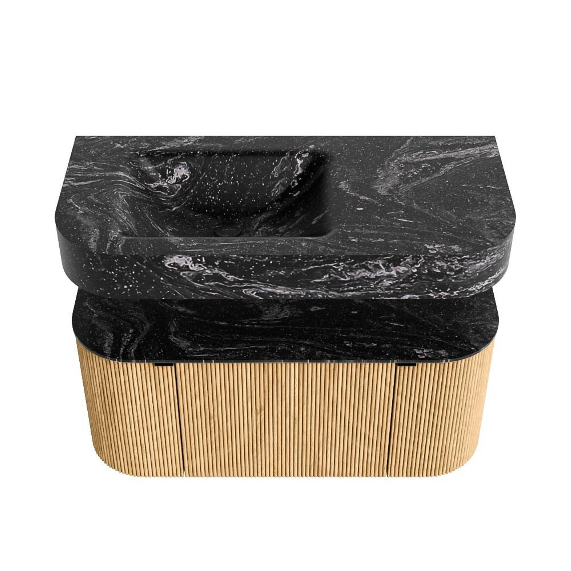 MONDIAZ THOR-DLUX 100cm badmeubel ronding links + rechts kleur Oak met 1 lade en 2 deuren. Vrijhangende wastafel CLOUD Links zonder kraangat kleur Lava.