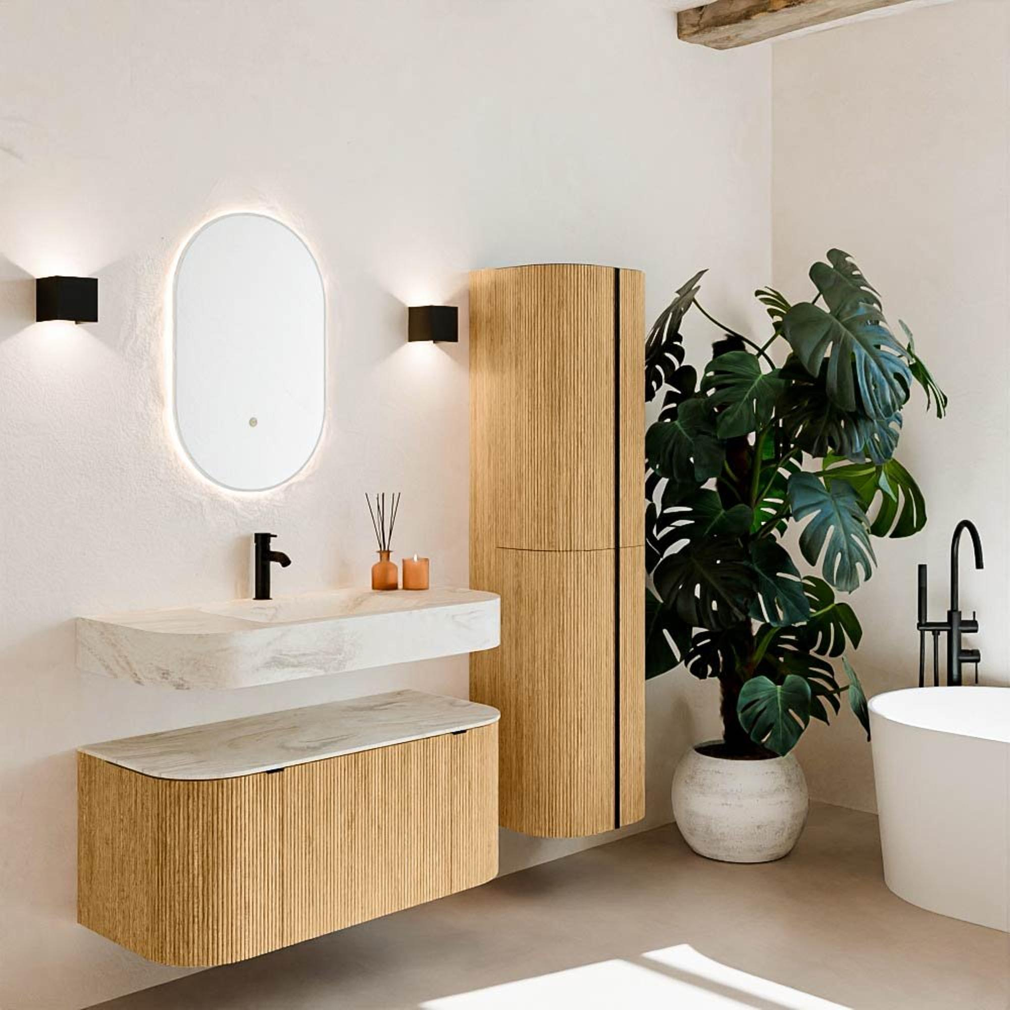 Natuurlijke materialen in warme tinten. De verticale ribbels brengen ritme en textuur in het ontwerp, terwijl het eikenhout zorgt voor een warme, ambachtelijke uitstraling. Kies uit 5 houttinten OAK, WALNUT, DUSK, SHADOW en RUBY zorgvuldig geselecteerde houtkleuren om zowel moderne als klassieke badkamers te verrijken.