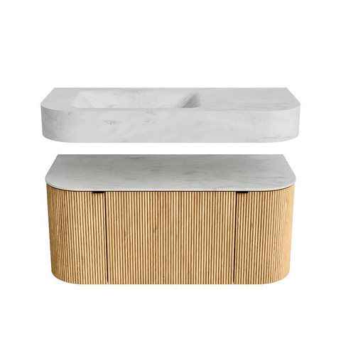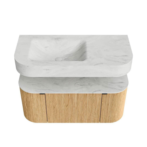 MONDIAZ THOR-DLUX 100cm badmeubel ronding links + rechts kleur Oak met 1 lade en 2 deuren. Vrijhangende wastafel CLOUD Links 1 kraangat kleur Opalo.