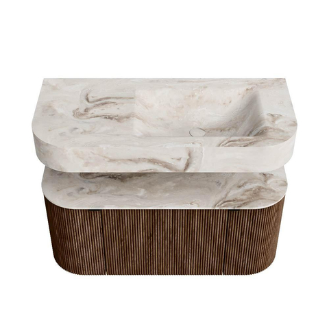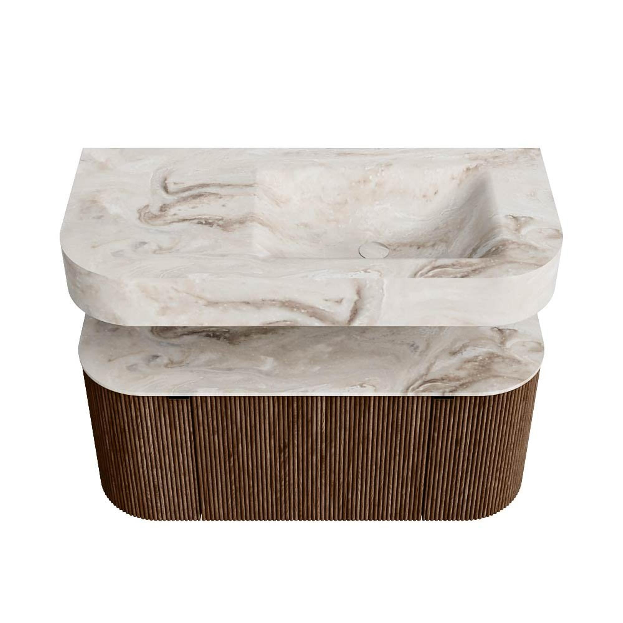 MONDIAZ THOR-DLUX 100cm badmeubel ronding links + rechts kleur Walnut met 1 lade en 2 deuren. Vrijhangende wastafel CLOUD Rechts 1 kraangat kleur Frappe.