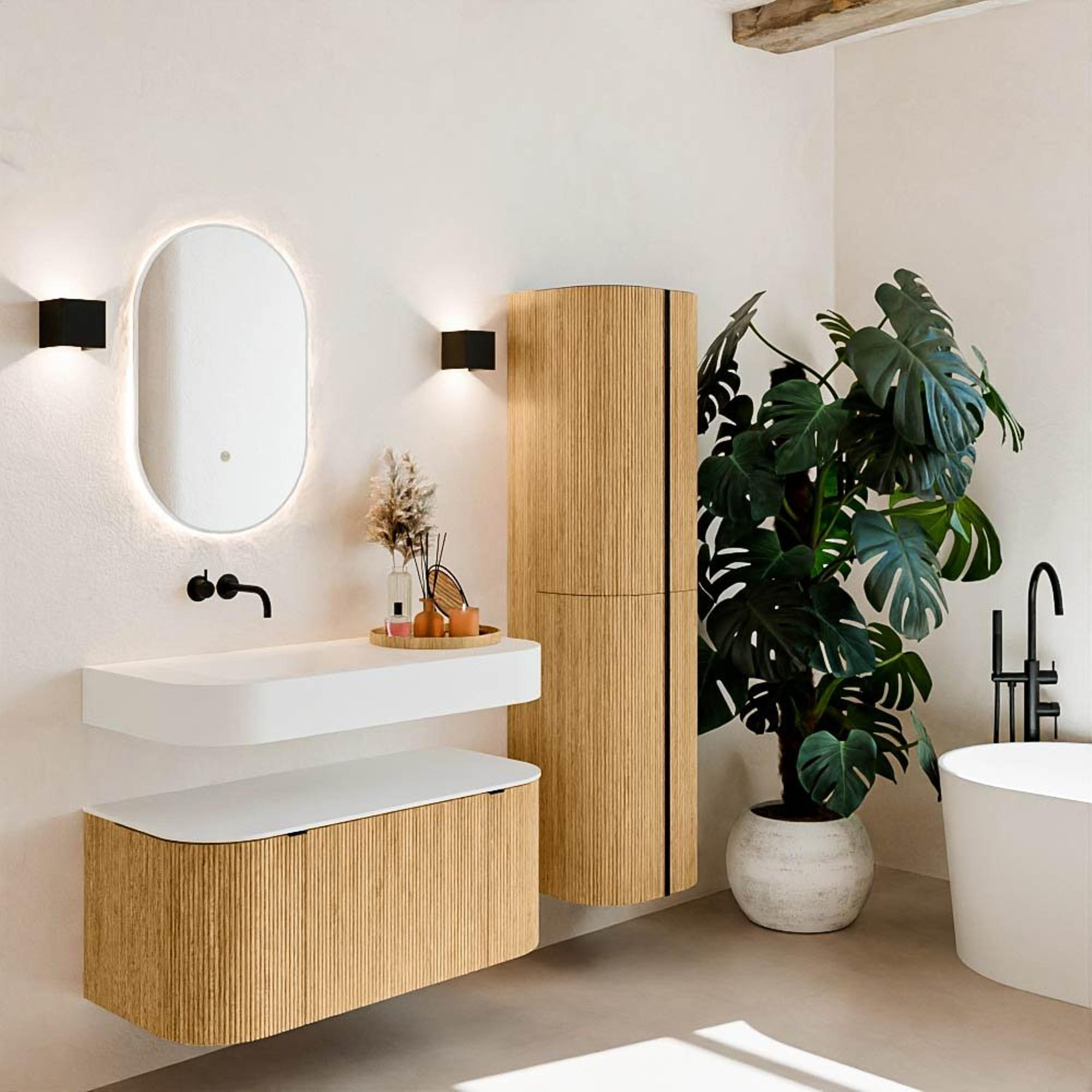 Natuurlijke materialen in warme tinten. De verticale ribbels brengen ritme en textuur in het ontwerp, terwijl het eikenhout zorgt voor een warme, ambachtelijke uitstraling. Kies uit 5 houttinten OAK, WALNUT, DUSK, SHADOW en RUBY zorgvuldig geselecteerde houtkleuren om zowel moderne als klassieke badkamers te verrijken.