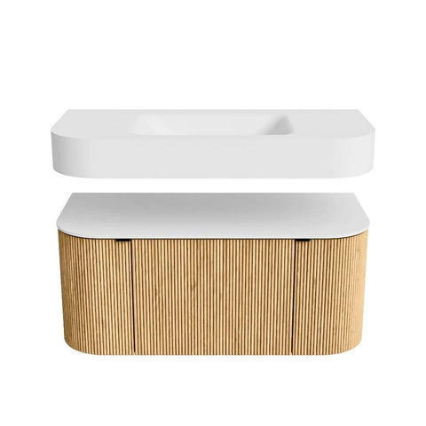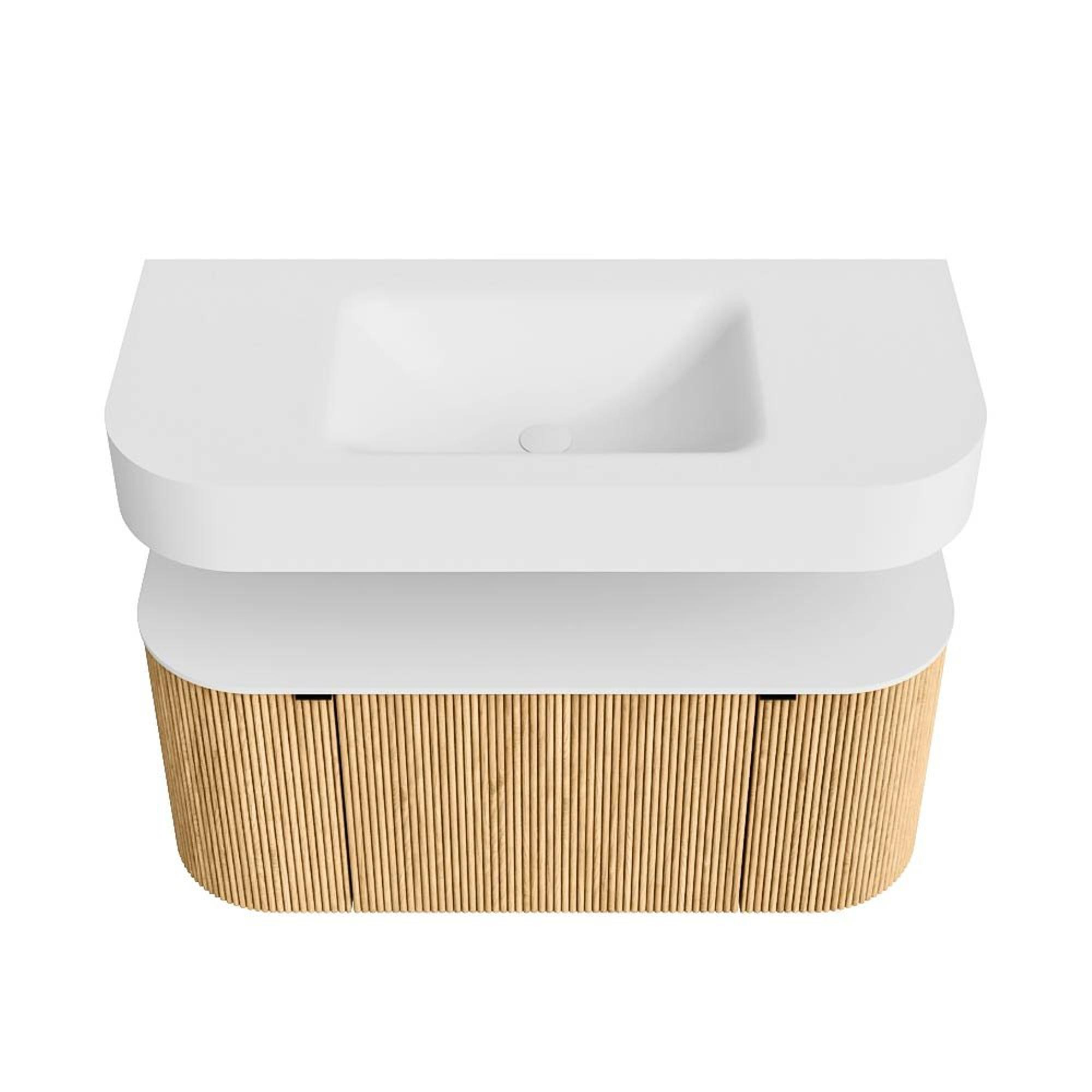 Boven het meubel zweeft een bijpassende, vrij hangende wastafel met afgeronde hoeken – perfect afgestemd op de vorm van de kast. De wastafel is uitgevoerd in Solid Surface en volgt subtiel de lijnen van het onderliggende meubel, waardoor een harmonieus geheel ontstaat. Het Solid Surface topblad vormt een sterke, onderhoudsvriendelijke basis en maakt de combinatie compleet.
