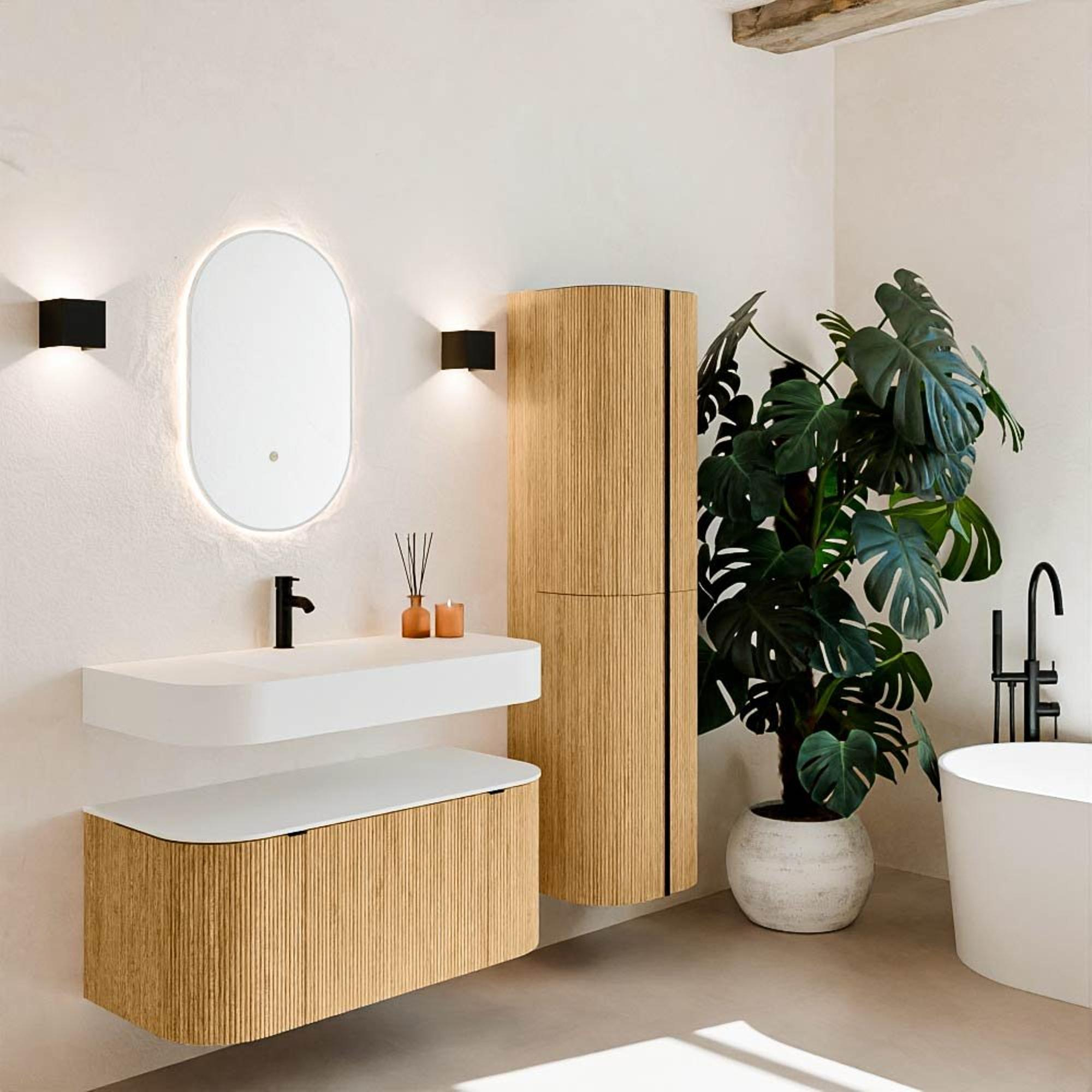 Natuurlijke materialen in warme tinten. De verticale ribbels brengen ritme en textuur in het ontwerp, terwijl het eikenhout zorgt voor een warme, ambachtelijke uitstraling. Kies uit 5 houttinten OAK, WALNUT, DUSK, SHADOW en RUBY zorgvuldig geselecteerde houtkleuren om zowel moderne als klassieke badkamers te verrijken.