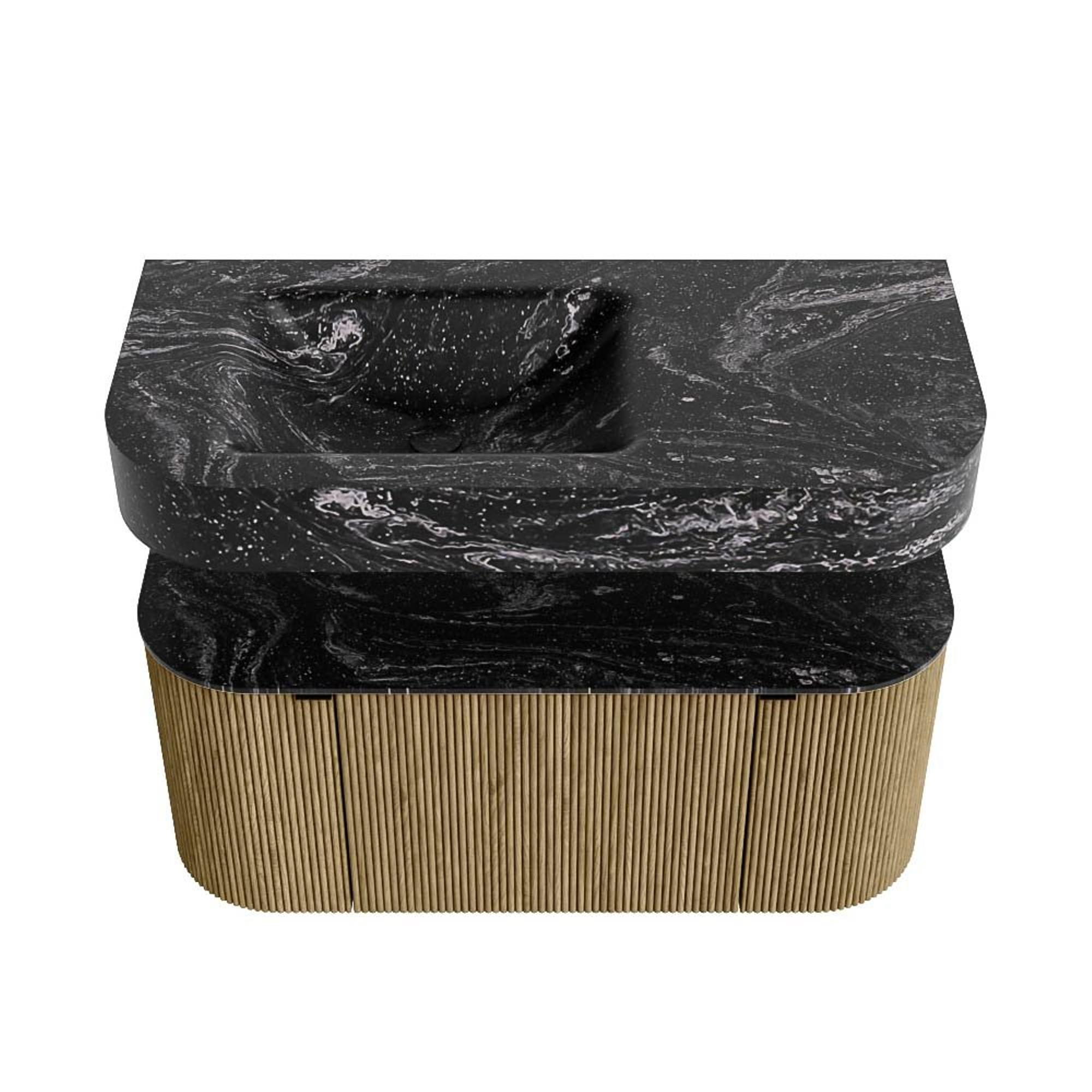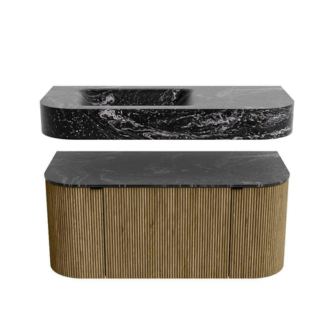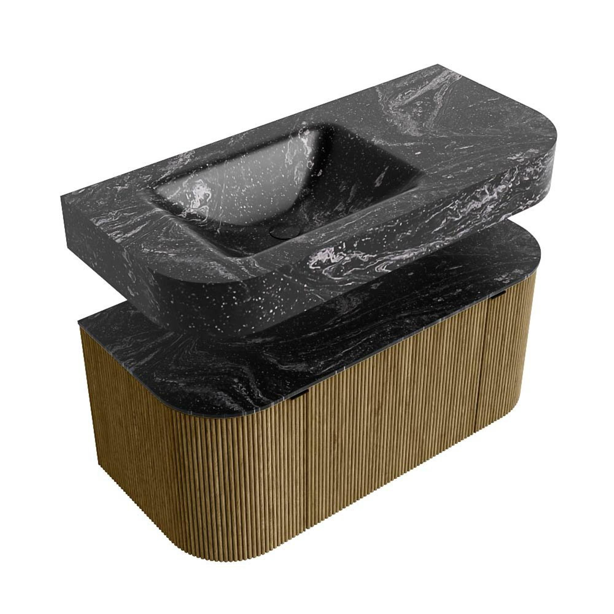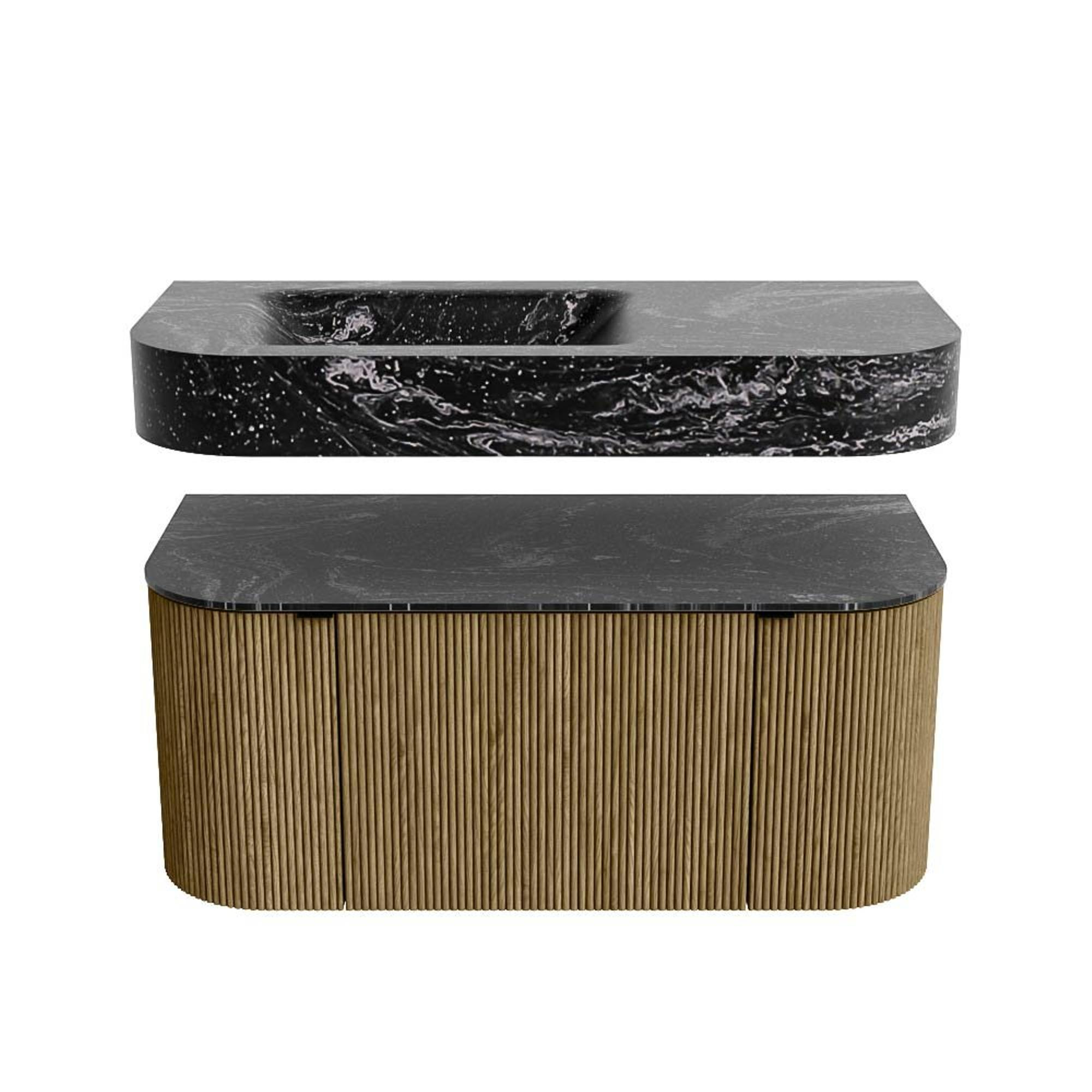 MONDIAZ THOR-DLUX 100cm badmeubel ronding links + rechts kleur Dusk met 1 lade en 2 deuren. Vrijhangende wastafel CLOUD Links 1 kraangat kleur Lava.