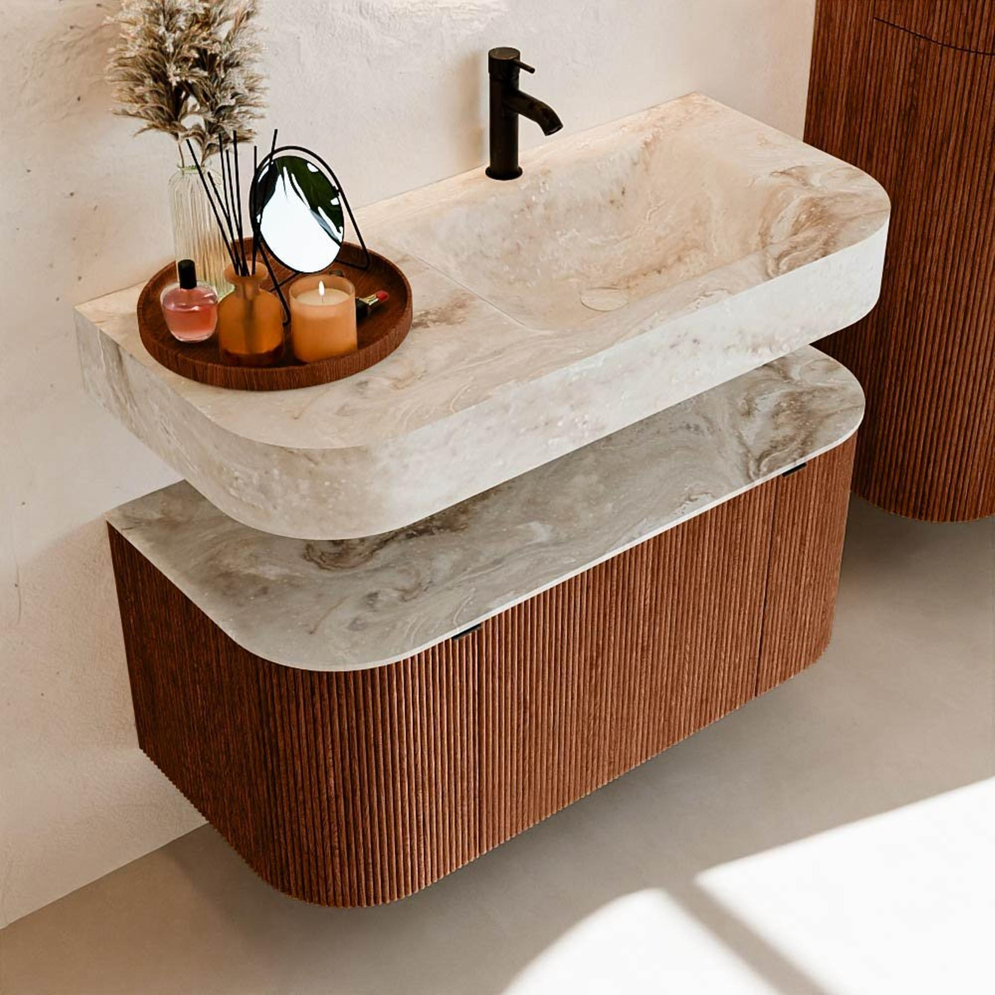 MONDIAZ THOR-DLUX 100cm badmeubel ronding links + rechts kleur Ruby met 1 lade en 2 deuren. Vrijhangende wastafel CLOUD Rechts 1 kraangat kleur Frappe.