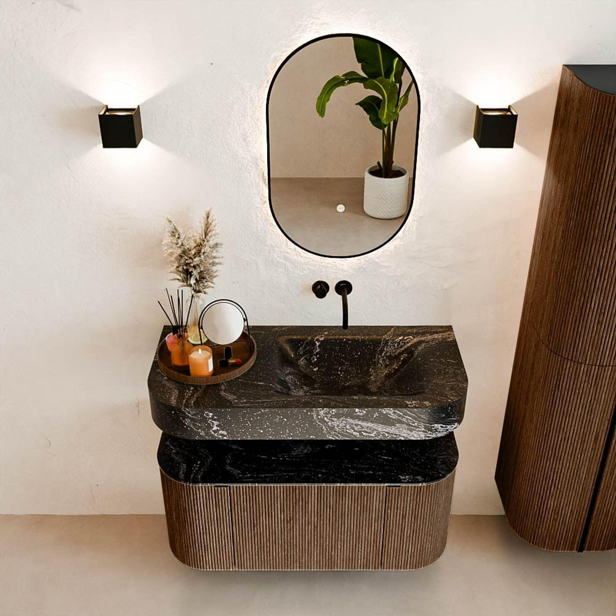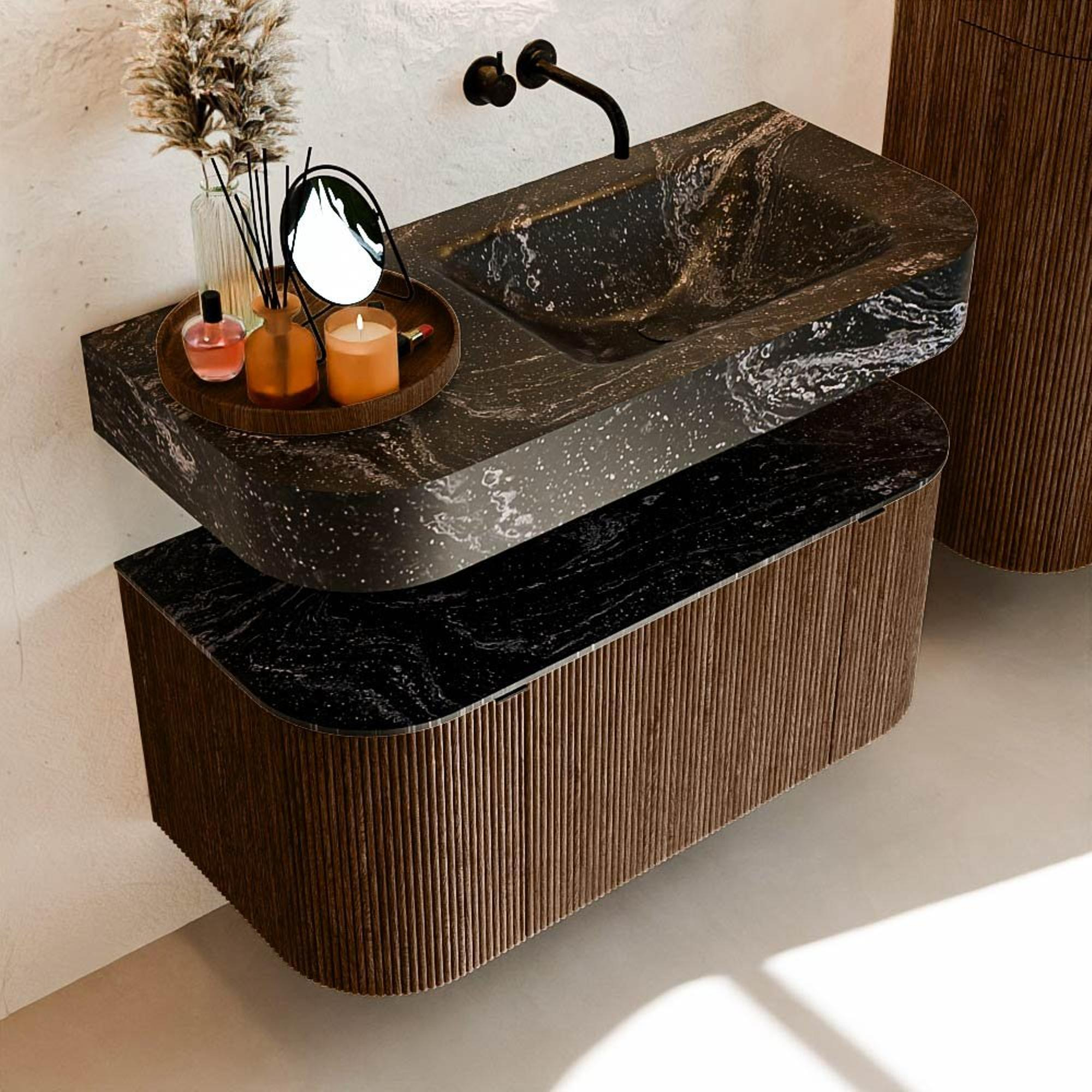 MONDIAZ THOR-DLUX 100cm badmeubel ronding links + rechts kleur Walnut met 1 lade en 2 deuren. Vrijhangende wastafel CLOUD Rechts zonder kraangat kleur Lava.