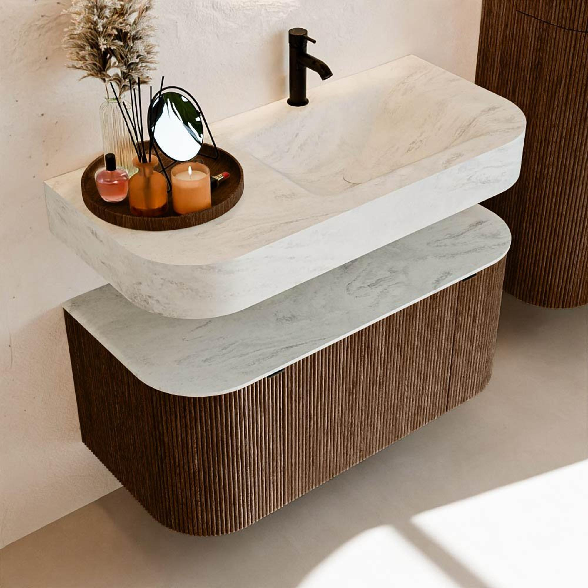 MONDIAZ THOR-DLUX 100cm badmeubel ronding links + rechts kleur Walnut met 1 lade en 2 deuren. Vrijhangende wastafel CLOUD Rechts 1 kraangat kleur Opalo.