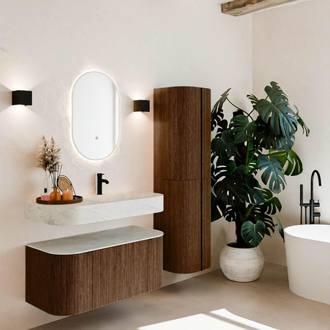 Natuurlijke materialen in warme tinten. De verticale ribbels brengen ritme en textuur in het ontwerp, terwijl het eikenhout zorgt voor een warme, ambachtelijke uitstraling. Kies uit 5 houttinten OAK, WALNUT, DUSK, SHADOW en RUBY zorgvuldig geselecteerde houtkleuren om zowel moderne als klassieke badkamers te verrijken.