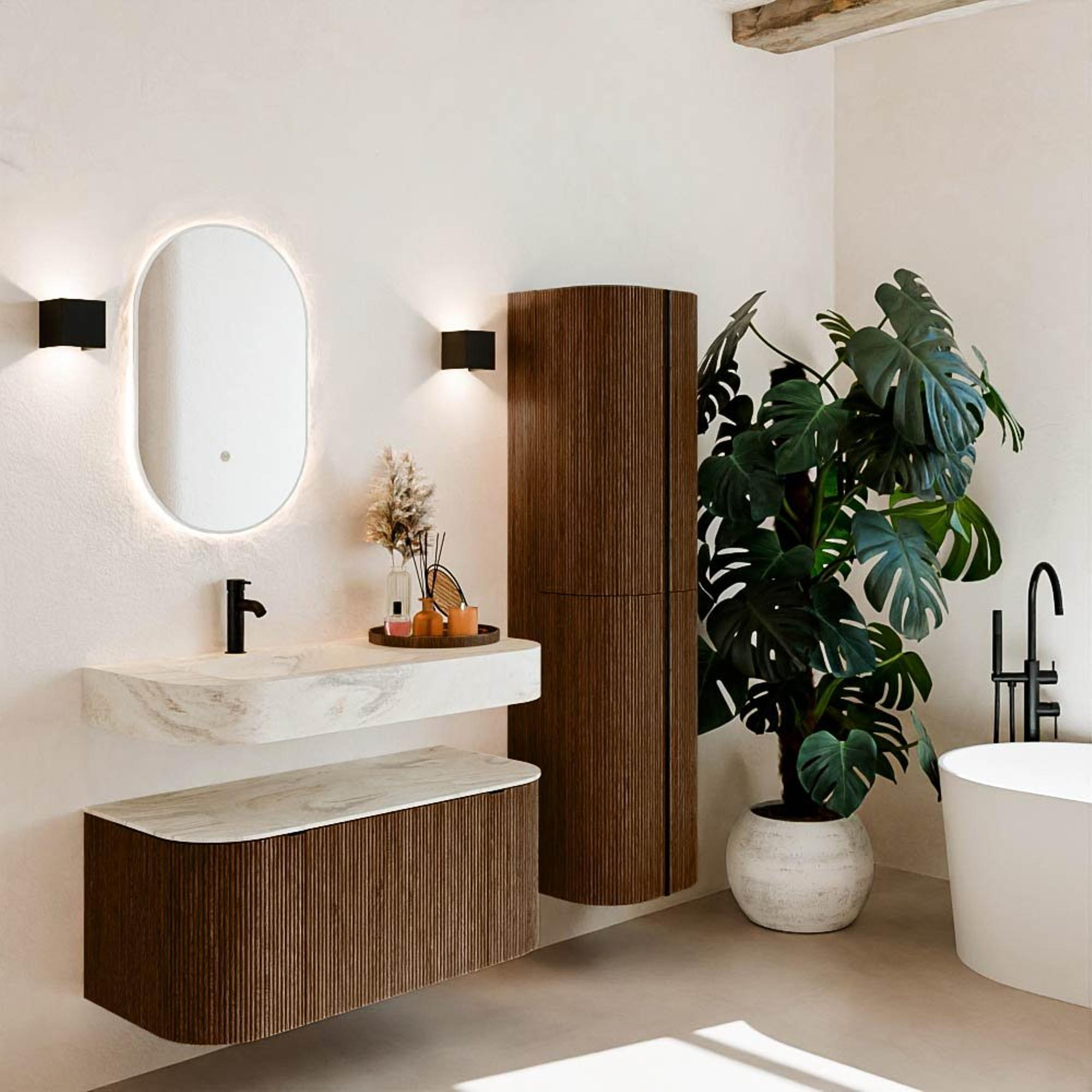 Natuurlijke materialen in warme tinten. De verticale ribbels brengen ritme en textuur in het ontwerp, terwijl het eikenhout zorgt voor een warme, ambachtelijke uitstraling. Kies uit 5 houttinten OAK, WALNUT, DUSK, SHADOW en RUBY zorgvuldig geselecteerde houtkleuren om zowel moderne als klassieke badkamers te verrijken.