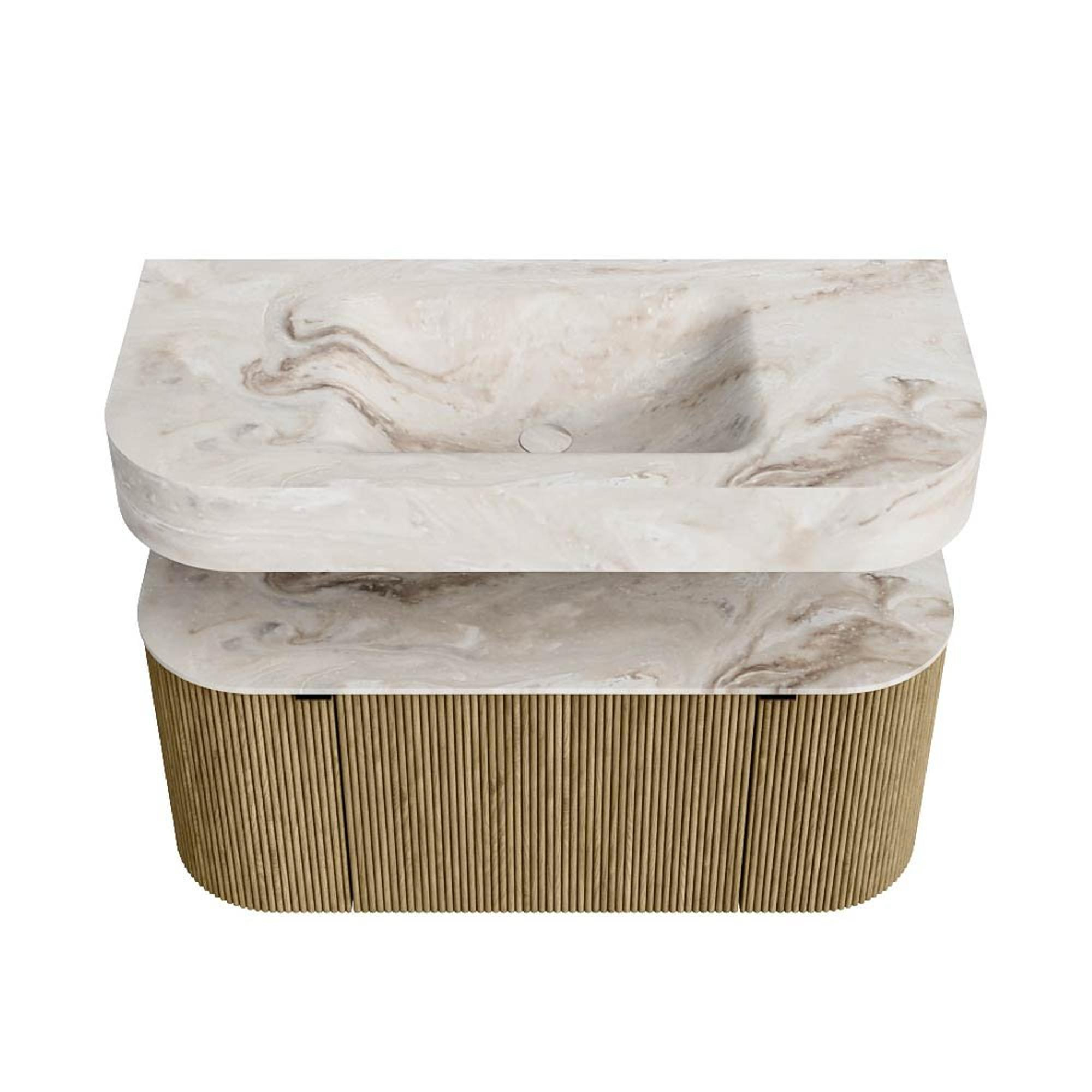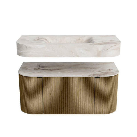 Boven het meubel zweeft een bijpassende, vrij hangende wastafel met afgeronde hoeken – perfect afgestemd op de vorm van de kast. De wastafel is uitgevoerd in Solid Surface en volgt subtiel de lijnen van het onderliggende meubel, waardoor een harmonieus geheel ontstaat. Het Solid Surface topblad vormt een sterke, onderhoudsvriendelijke basis en maakt de combinatie compleet.