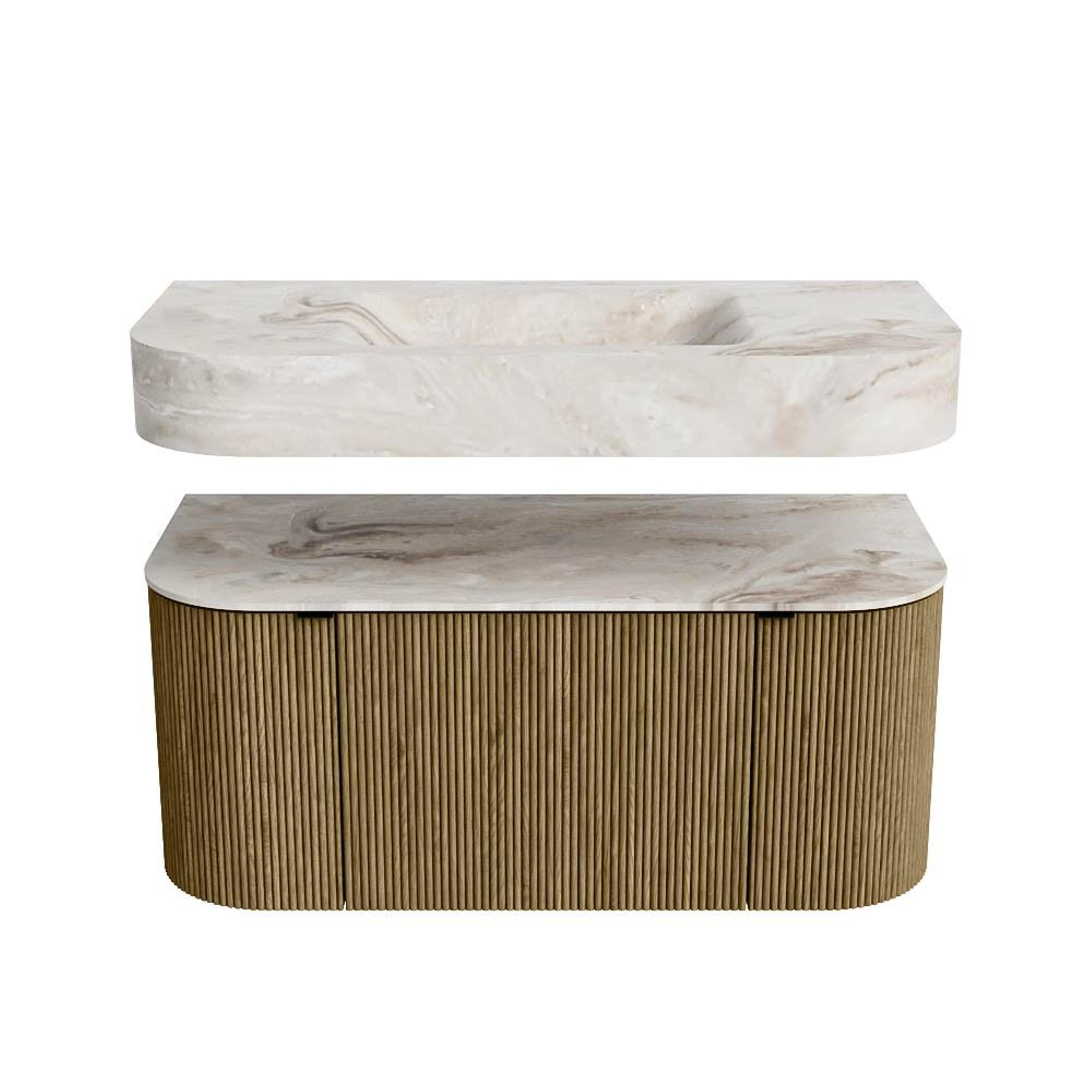 MONDIAZ THOR-DLUX 100cm badmeubel ronding links + rechts kleur Dusk met 1 lade en 2 deuren. Vrijhangende wastafel CLOUD Midden zonder kraangat kleur Frappe.
