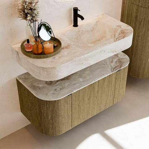 MONDIAZ THOR-DLUX 100cm badmeubel ronding links + rechts kleur Dusk met 1 lade en 2 deuren. Vrijhangende wastafel CLOUD Rechts 1 kraangat kleur Frappe.