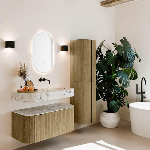 Natuurlijke materialen in warme tinten. De verticale ribbels brengen ritme en textuur in het ontwerp, terwijl het eikenhout zorgt voor een warme, ambachtelijke uitstraling. Kies uit 5 houttinten OAK, WALNUT, DUSK, SHADOW en RUBY zorgvuldig geselecteerde houtkleuren om zowel moderne als klassieke badkamers te verrijken.