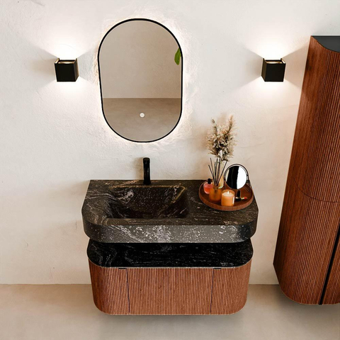 Natuurlijke materialen in warme tinten. De verticale ribbels brengen ritme en textuur in het ontwerp, terwijl het eikenhout zorgt voor een warme, ambachtelijke uitstraling. Kies uit 5 houttinten OAK, WALNUT, DUSK, SHADOW en RUBY zorgvuldig geselecteerde houtkleuren om zowel moderne als klassieke badkamers te verrijken.