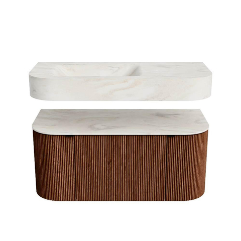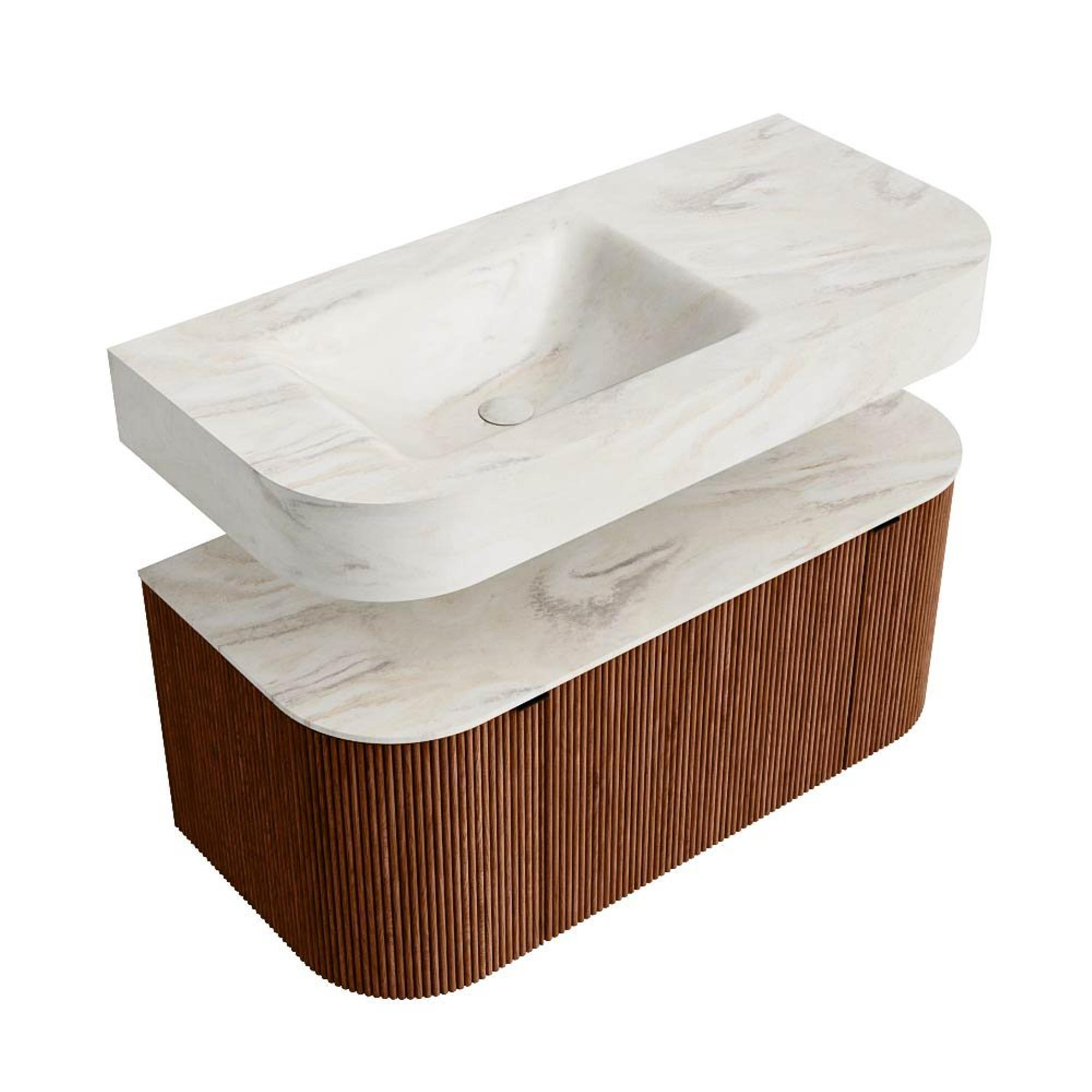 MONDIAZ THOR-DLUX 100cm badmeubel ronding links + rechts kleur Ruby met 1 lade en 2 deuren. Vrijhangende wastafel CLOUD Links zonder kraangat kleur Ostra.
