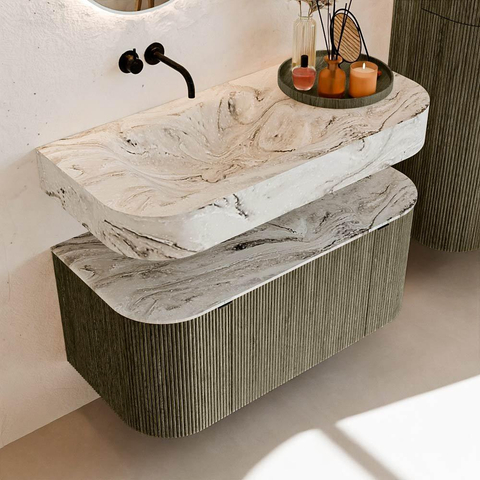 Boven het meubel zweeft een bijpassende, vrij hangende wastafel met afgeronde hoeken – perfect afgestemd op de vorm van de kast. De wastafel is uitgevoerd in Solid Surface en volgt subtiel de lijnen van het onderliggende meubel, waardoor een harmonieus geheel ontstaat. Het Solid Surface topblad vormt een sterke, onderhoudsvriendelijke basis en maakt de combinatie compleet.