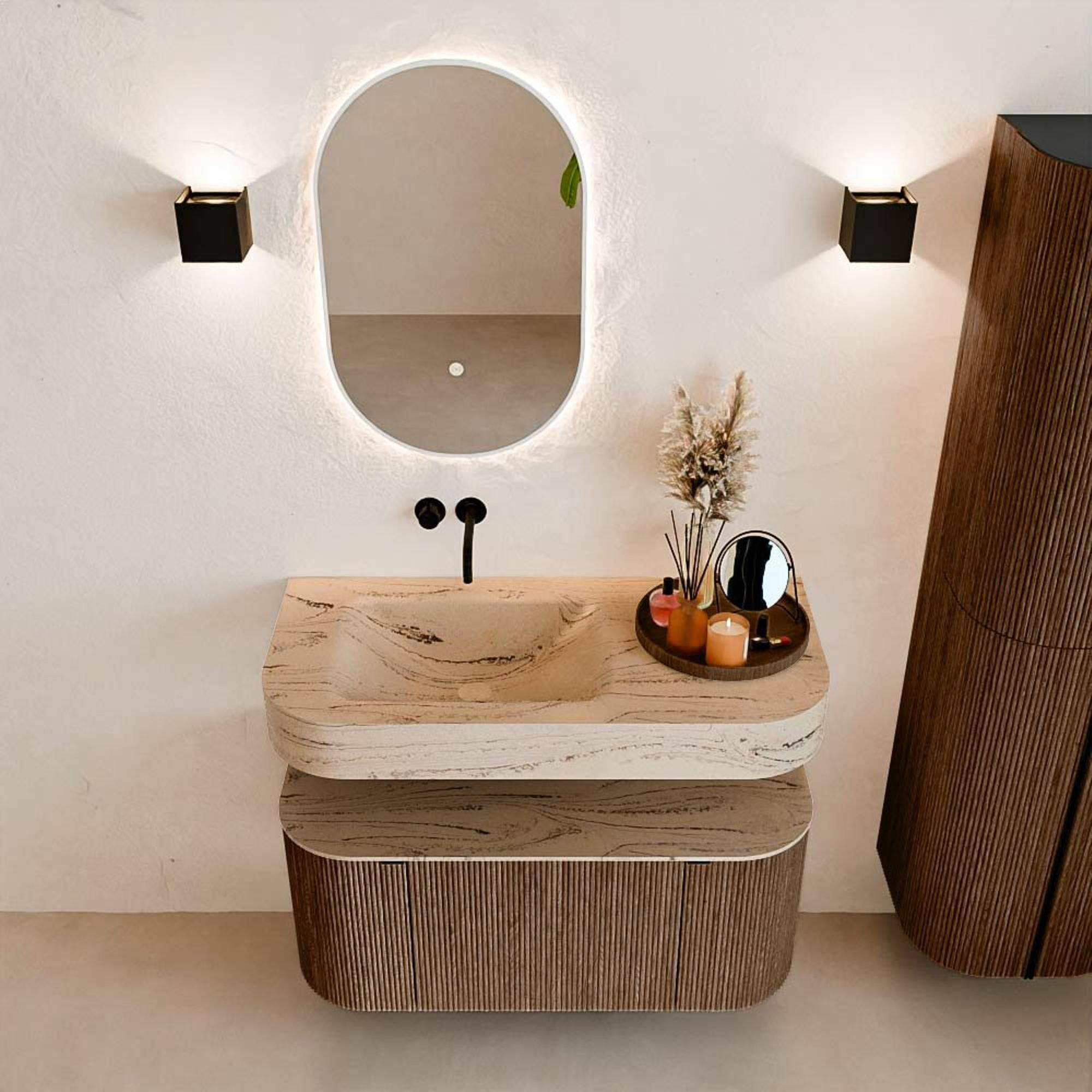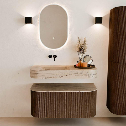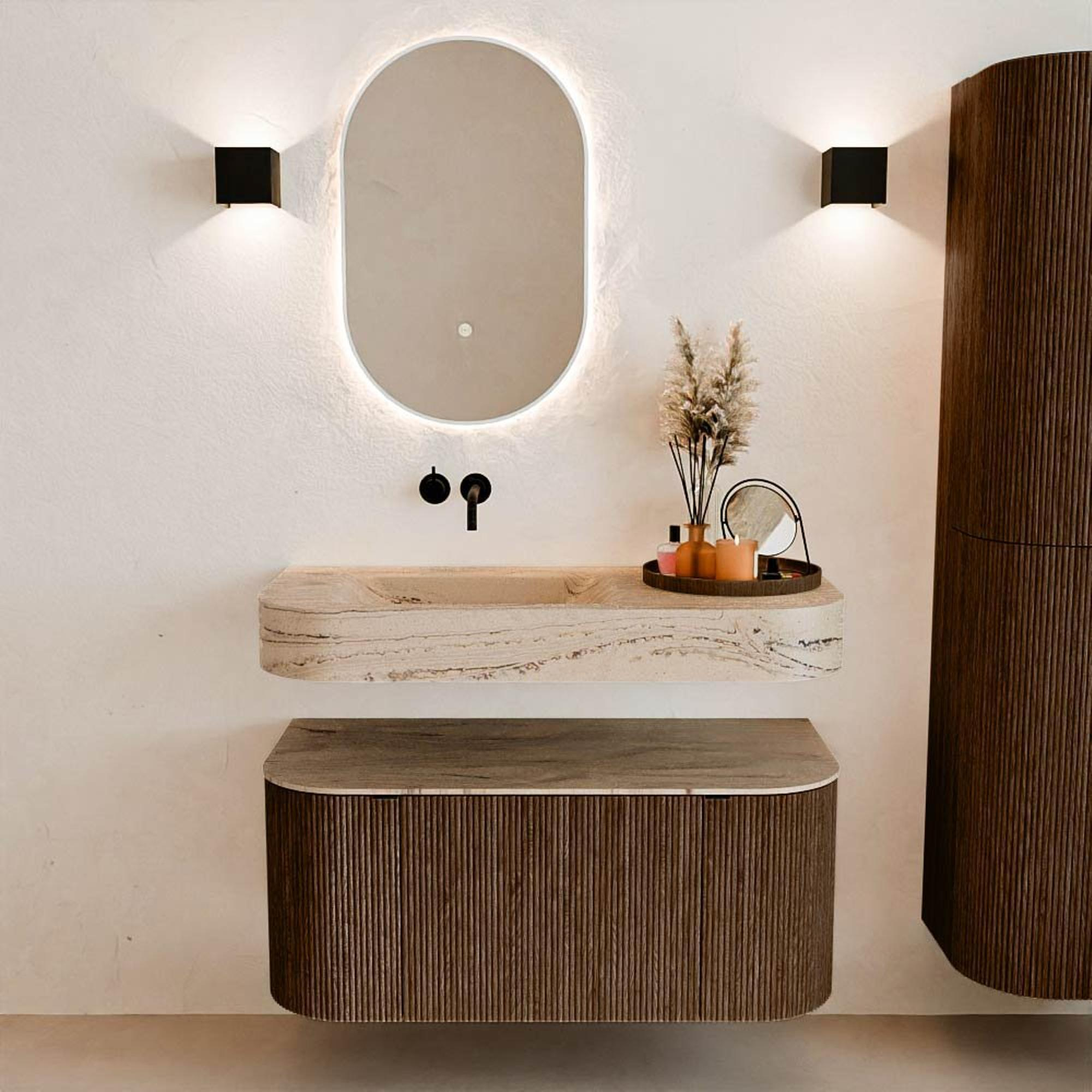 Natuurlijke materialen in warme tinten. De verticale ribbels brengen ritme en textuur in het ontwerp, terwijl het eikenhout zorgt voor een warme, ambachtelijke uitstraling. Kies uit 5 houttinten OAK, WALNUT, DUSK, SHADOW en RUBY zorgvuldig geselecteerde houtkleuren om zowel moderne als klassieke badkamers te verrijken.