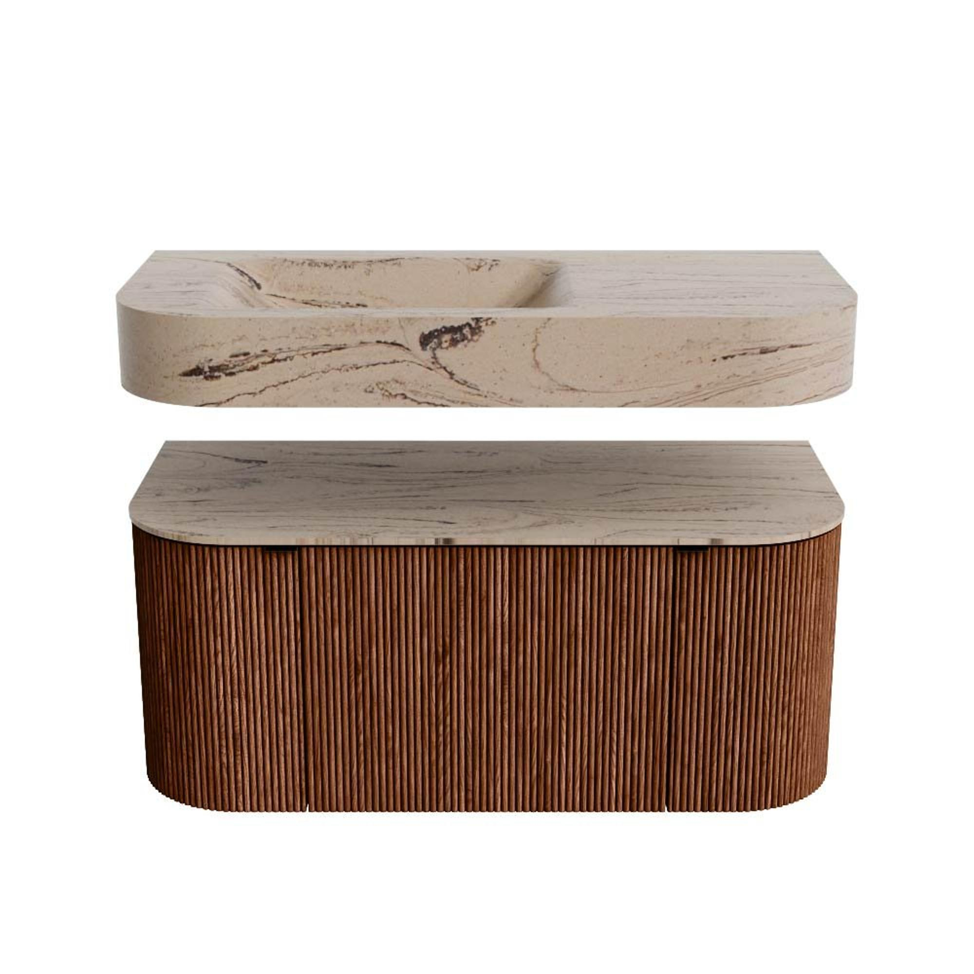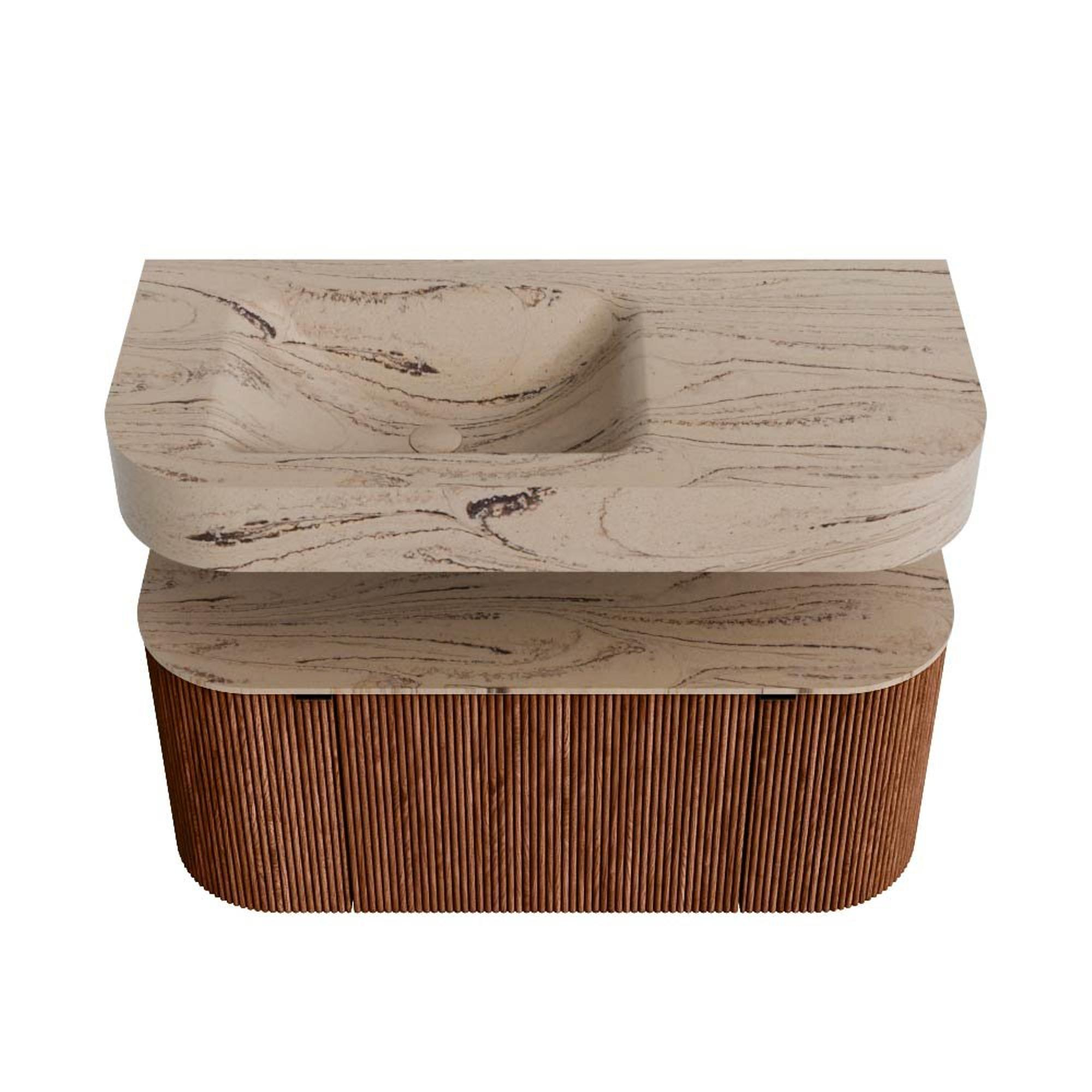 MONDIAZ THOR-DLUX 100cm badmeubel ronding links + rechts kleur Ruby met 1 lade en 2 deuren. Vrijhangende wastafel CLOUD Links 1 kraangat kleur Arena.