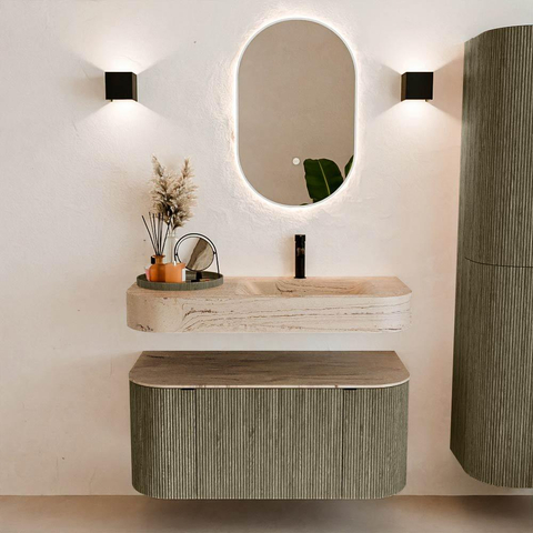 Natuurlijke materialen in warme tinten. De verticale ribbels brengen ritme en textuur in het ontwerp, terwijl het eikenhout zorgt voor een warme, ambachtelijke uitstraling. Kies uit 5 houttinten OAK, WALNUT, DUSK, SHADOW en RUBY zorgvuldig geselecteerde houtkleuren om zowel moderne als klassieke badkamers te verrijken.