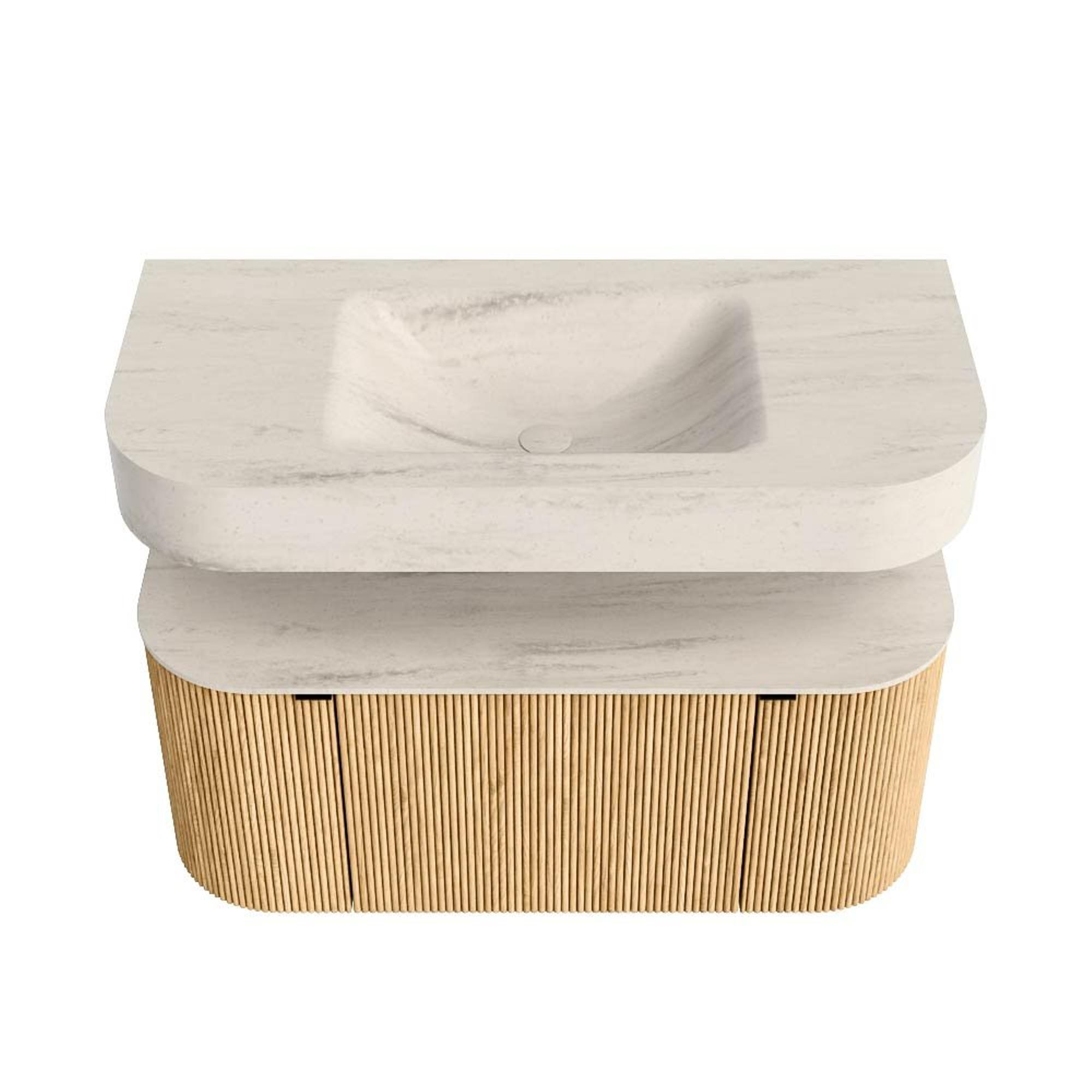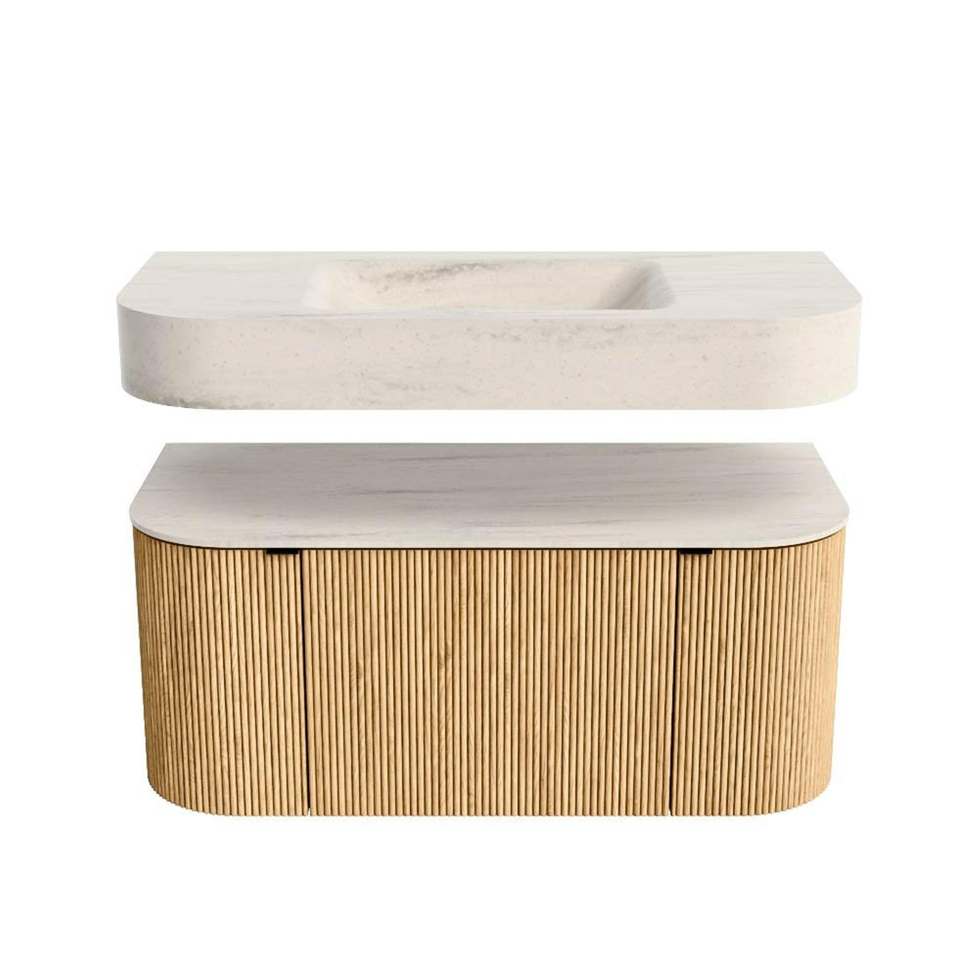 MONDIAZ THOR-DLUX 100cm badmeubel ronding links + rechts kleur Oak met 1 lade en 2 deuren. Vrijhangende wastafel CLOUD Midden zonder kraangat kleur Meli.