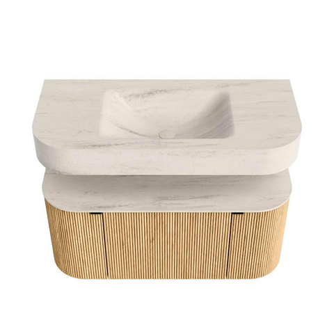 Boven het meubel zweeft een bijpassende, vrij hangende wastafel met afgeronde hoeken – perfect afgestemd op de vorm van de kast. De wastafel is uitgevoerd in Solid Surface en volgt subtiel de lijnen van het onderliggende meubel, waardoor een harmonieus geheel ontstaat. Het Solid Surface topblad vormt een sterke, onderhoudsvriendelijke basis en maakt de combinatie compleet.