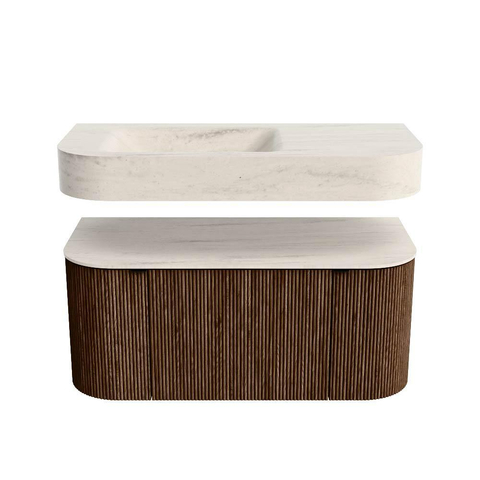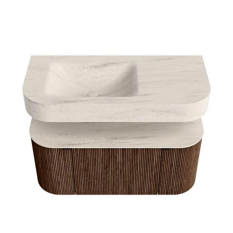 MONDIAZ THOR-DLUX 100cm badmeubel ronding links + rechts kleur Walnut met 1 lade en 2 deuren. Vrijhangende wastafel CLOUD Links zonder kraangat kleur Meli.