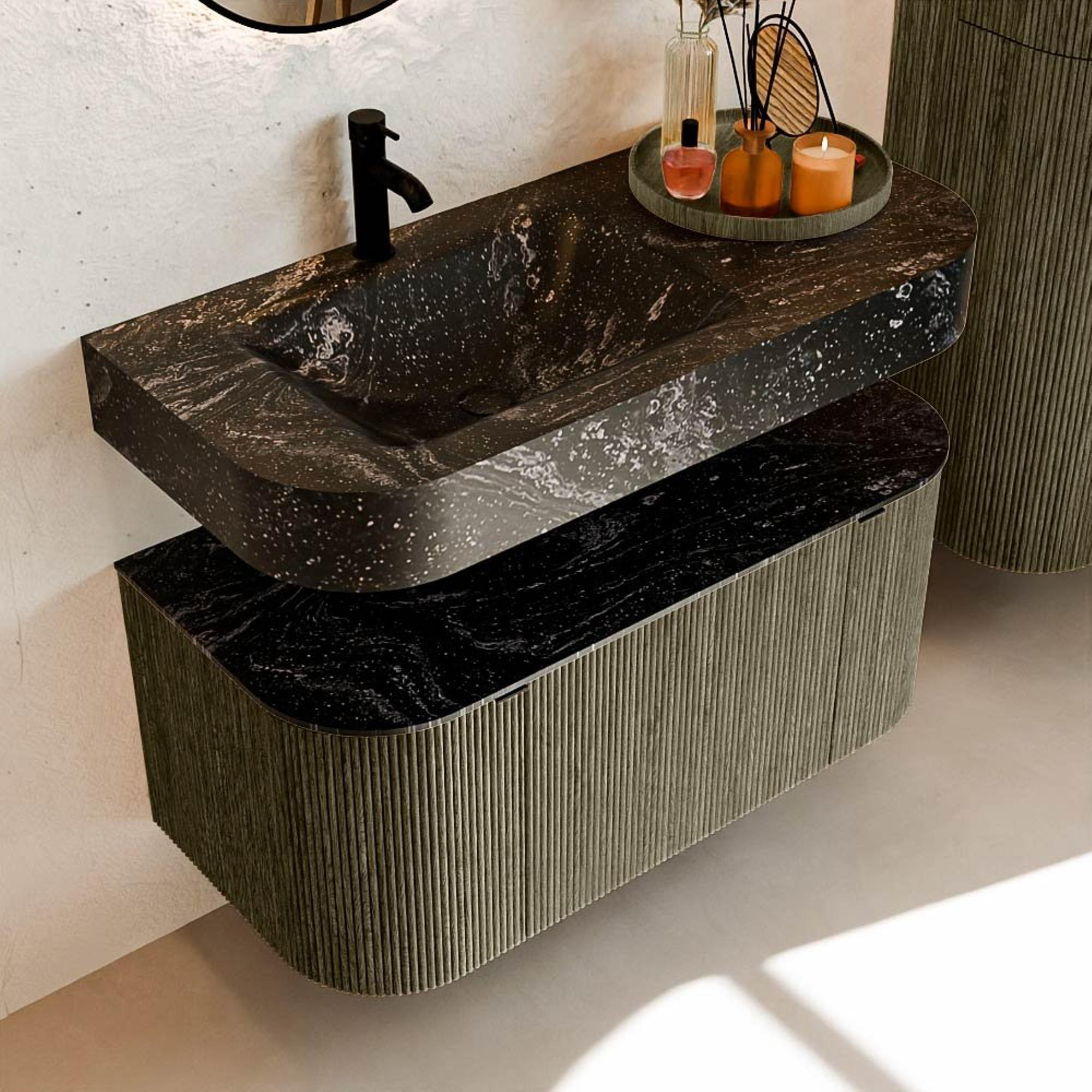 MONDIAZ THOR-DLUX 100cm badmeubel ronding links + rechts kleur Shadow met 1 lade en 2 deuren. Vrijhangende wastafel CLOUD Links 1 kraangat kleur Lava.