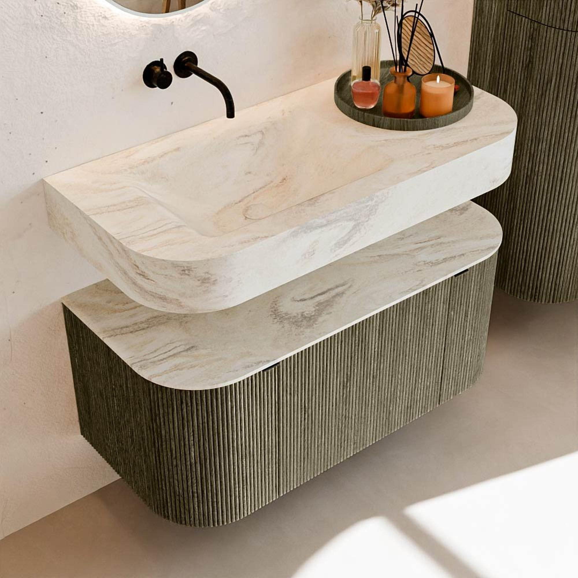 Boven het meubel zweeft een bijpassende, vrij hangende wastafel met afgeronde hoeken – perfect afgestemd op de vorm van de kast. De wastafel is uitgevoerd in Solid Surface en volgt subtiel de lijnen van het onderliggende meubel, waardoor een harmonieus geheel ontstaat. Het Solid Surface topblad vormt een sterke, onderhoudsvriendelijke basis en maakt de combinatie compleet.