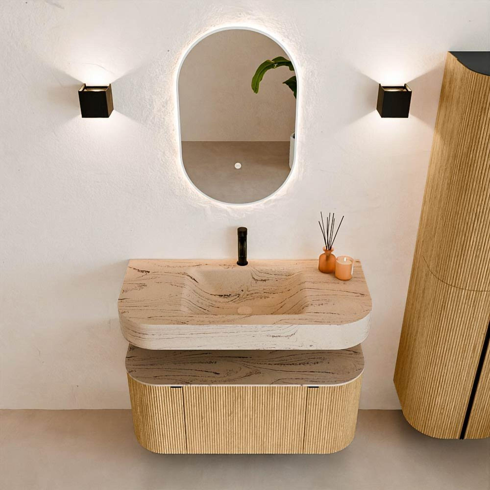 MONDIAZ THOR-DLUX 100cm badmeubel ronding links + rechts kleur Oak met 1 lade en 2 deuren. Vrijhangende wastafel CLOUD Midden 1 kraangat kleur Arena.