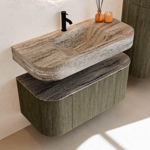 MONDIAZ THOR-DLUX 100cm badmeubel ronding links + rechts kleur Shadow met 1 lade en 2 deuren. Vrijhangende wastafel CLOUD Midden 1 kraangat kleur Oza.