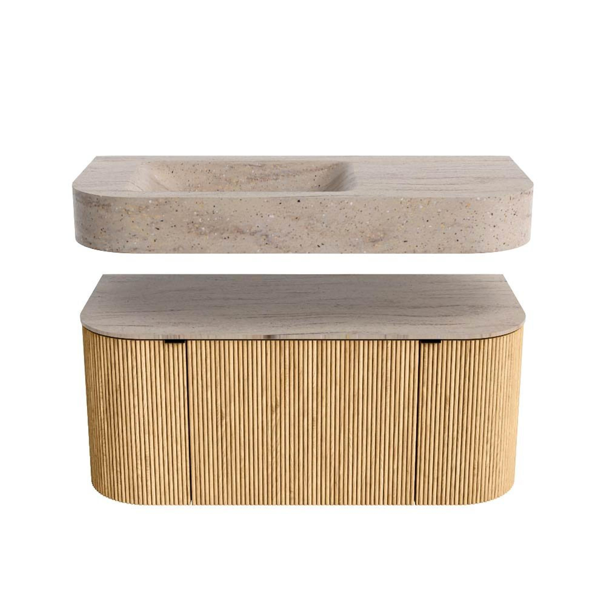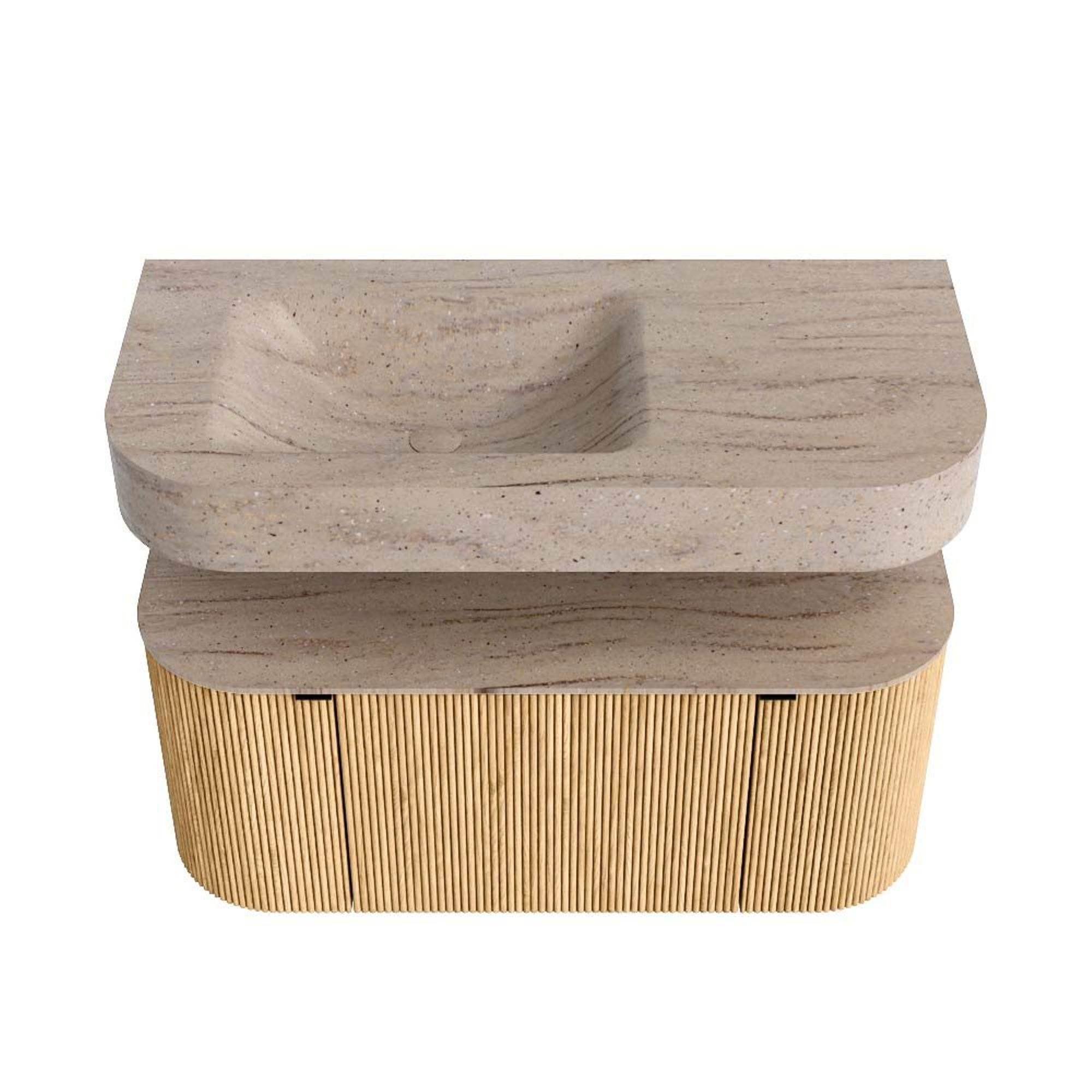 MONDIAZ THOR-DLUX 100cm badmeubel ronding links + rechts kleur Oak met 1 lade en 2 deuren. Vrijhangende wastafel CLOUD Links zonder kraangat kleur Saba.