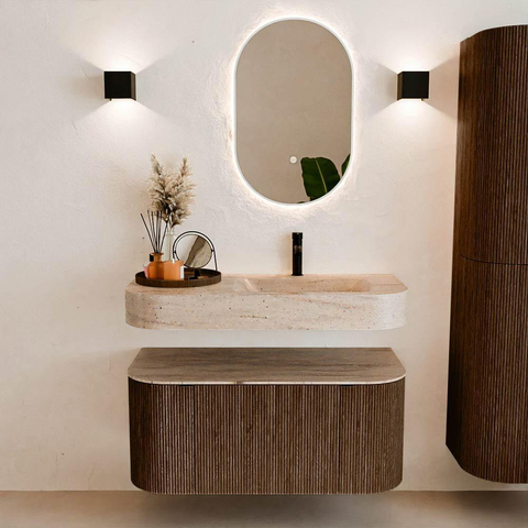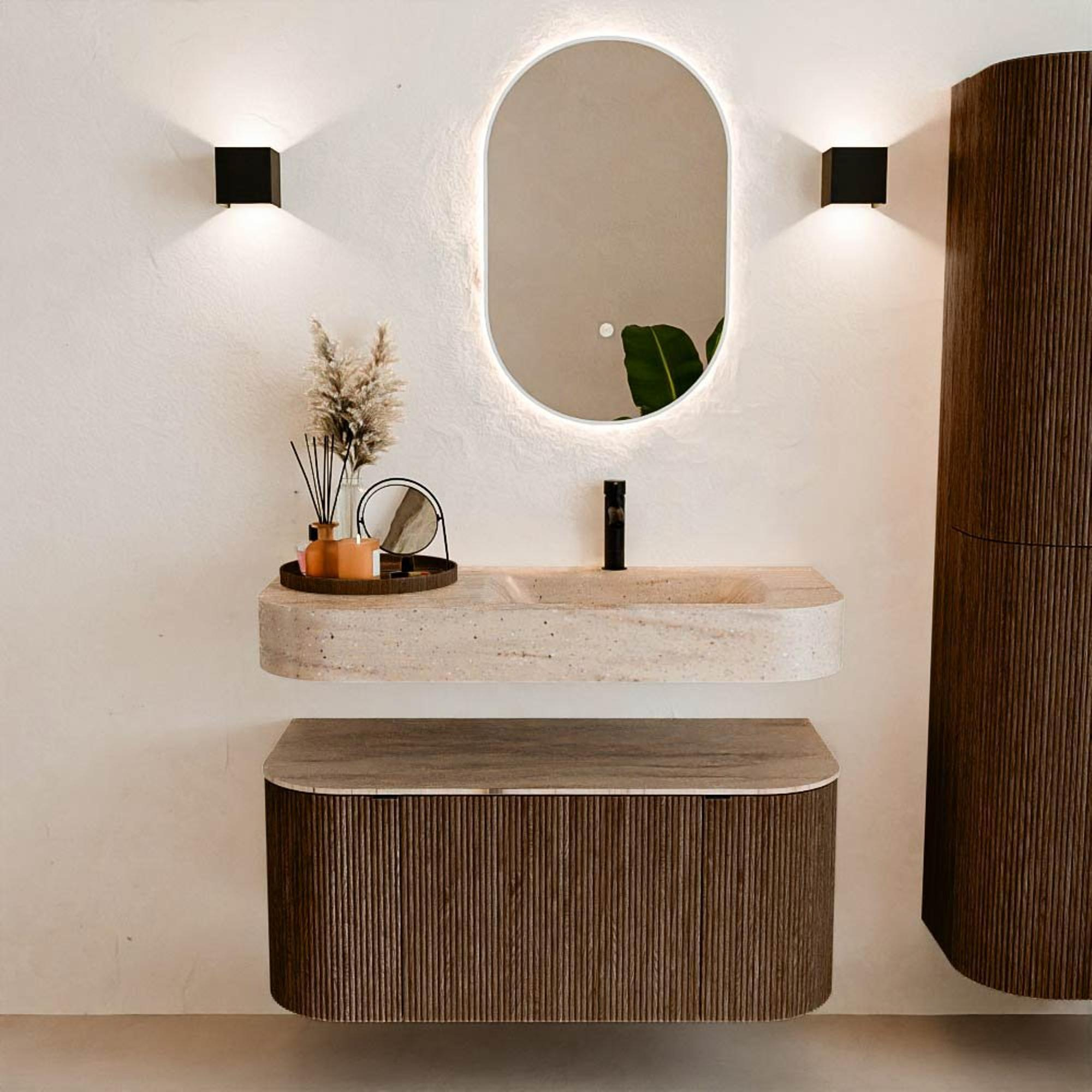 Natuurlijke materialen in warme tinten. De verticale ribbels brengen ritme en textuur in het ontwerp, terwijl het eikenhout zorgt voor een warme, ambachtelijke uitstraling. Kies uit 5 houttinten OAK, WALNUT, DUSK, SHADOW en RUBY zorgvuldig geselecteerde houtkleuren om zowel moderne als klassieke badkamers te verrijken.