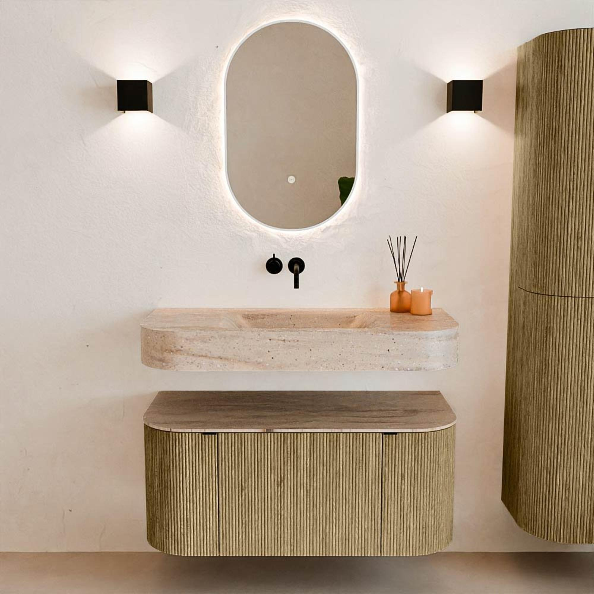 Natuurlijke materialen in warme tinten. De verticale ribbels brengen ritme en textuur in het ontwerp, terwijl het eikenhout zorgt voor een warme, ambachtelijke uitstraling. Kies uit 5 houttinten OAK, WALNUT, DUSK, SHADOW en RUBY zorgvuldig geselecteerde houtkleuren om zowel moderne als klassieke badkamers te verrijken.
