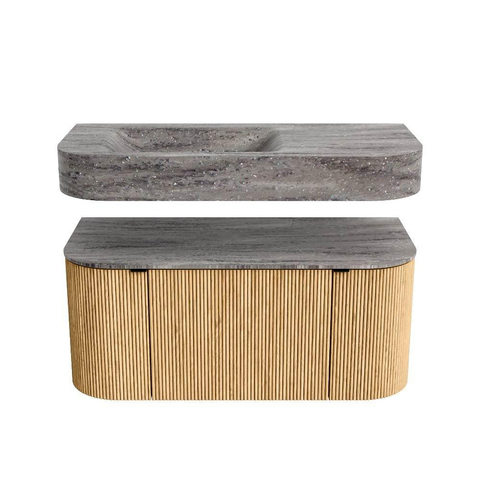 MONDIAZ THOR-DLUX 100cm badmeubel ronding links + rechts kleur Oak met 1 lade en 2 deuren. Vrijhangende wastafel CLOUD Links zonder kraangat kleur Oza.
