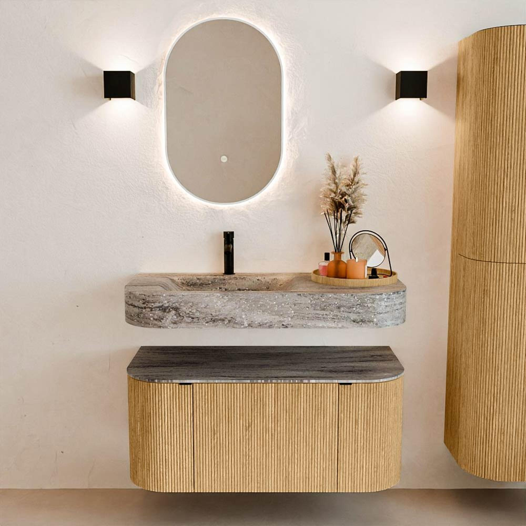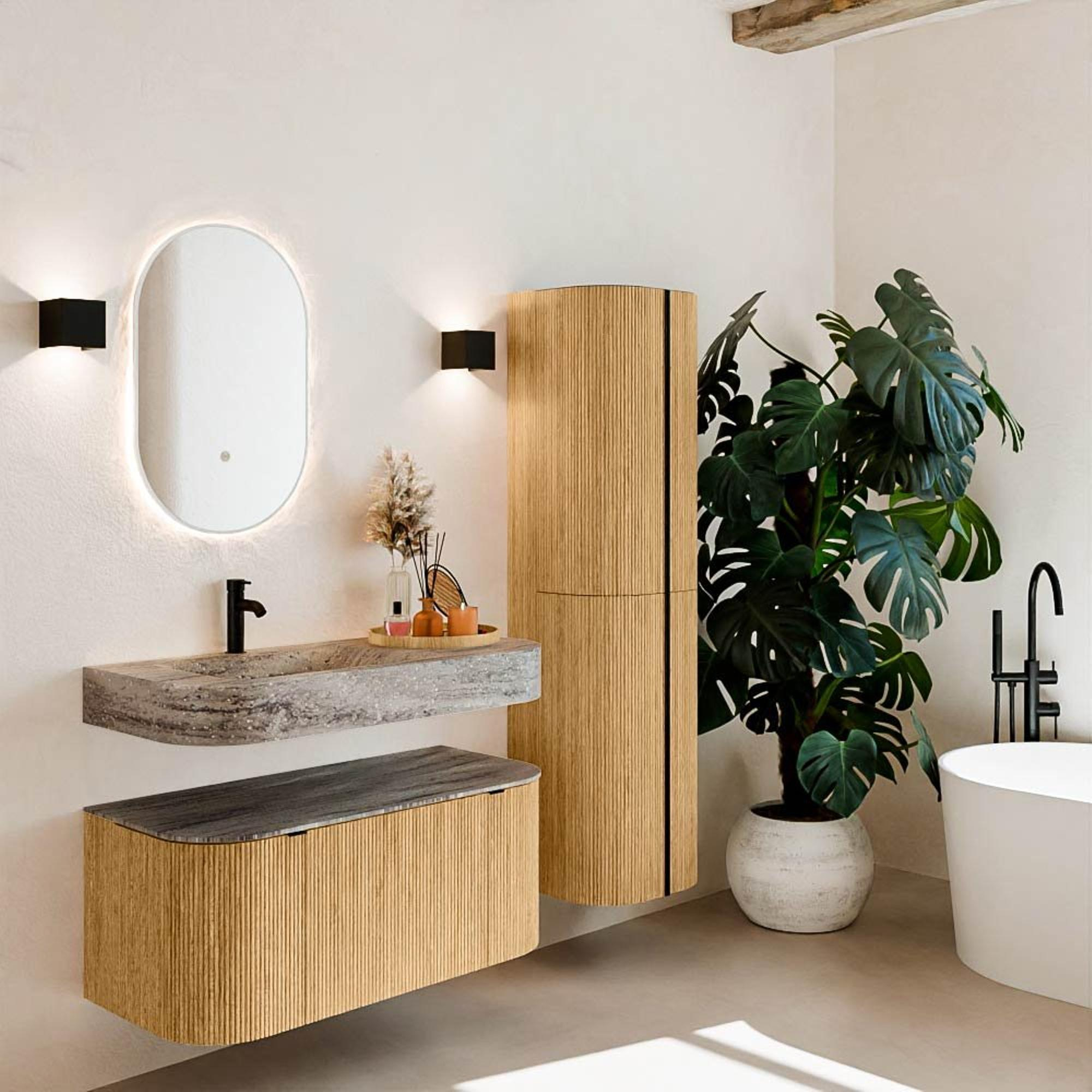 Natuurlijke materialen in warme tinten. De verticale ribbels brengen ritme en textuur in het ontwerp, terwijl het eikenhout zorgt voor een warme, ambachtelijke uitstraling. Kies uit 5 houttinten OAK, WALNUT, DUSK, SHADOW en RUBY zorgvuldig geselecteerde houtkleuren om zowel moderne als klassieke badkamers te verrijken.