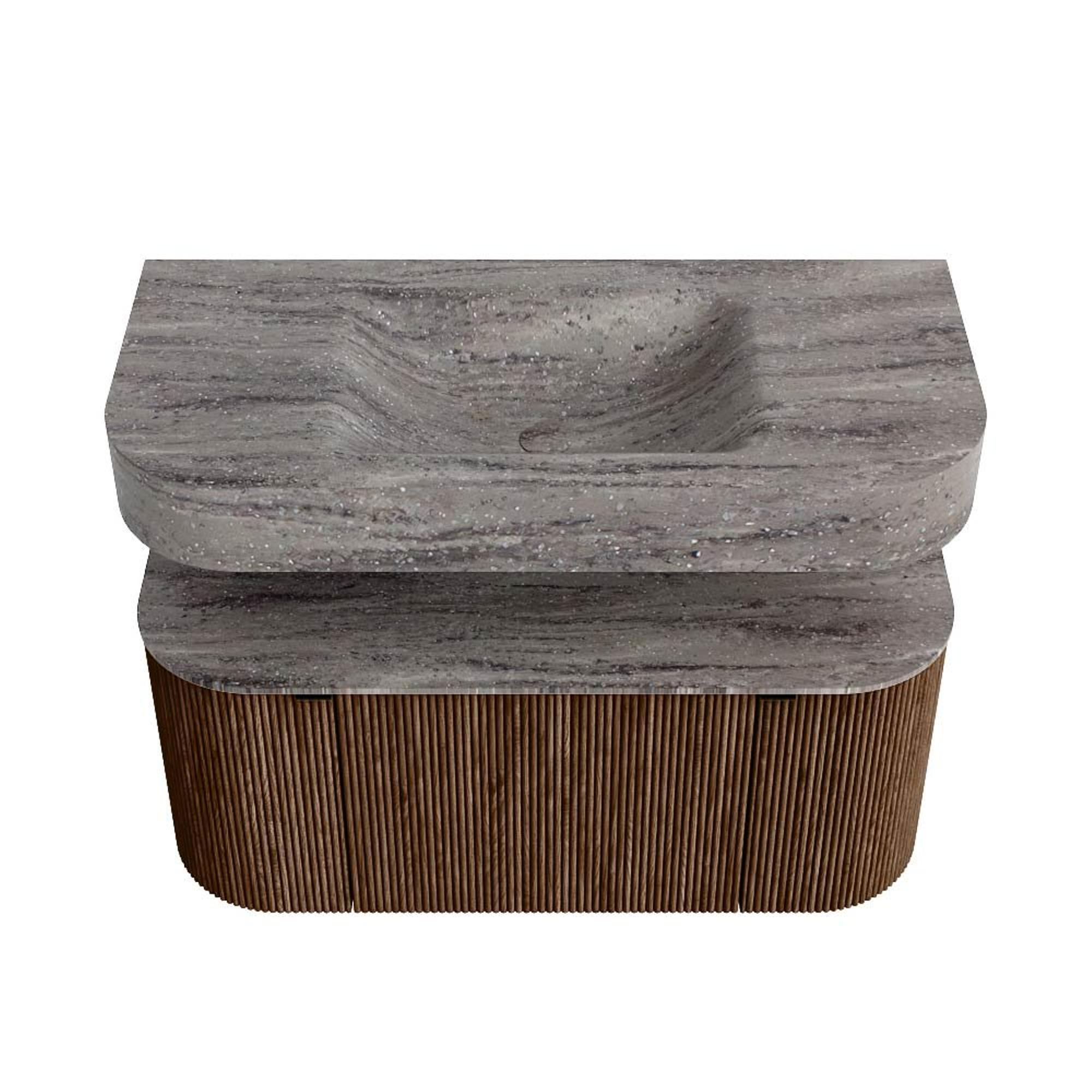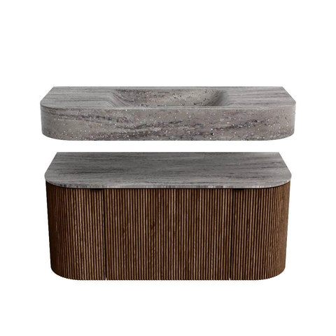 MONDIAZ THOR-DLUX 100cm badmeubel ronding links + rechts kleur Walnut met 1 lade en 2 deuren. Vrijhangende wastafel CLOUD Midden zonder kraangat kleur Oza.
